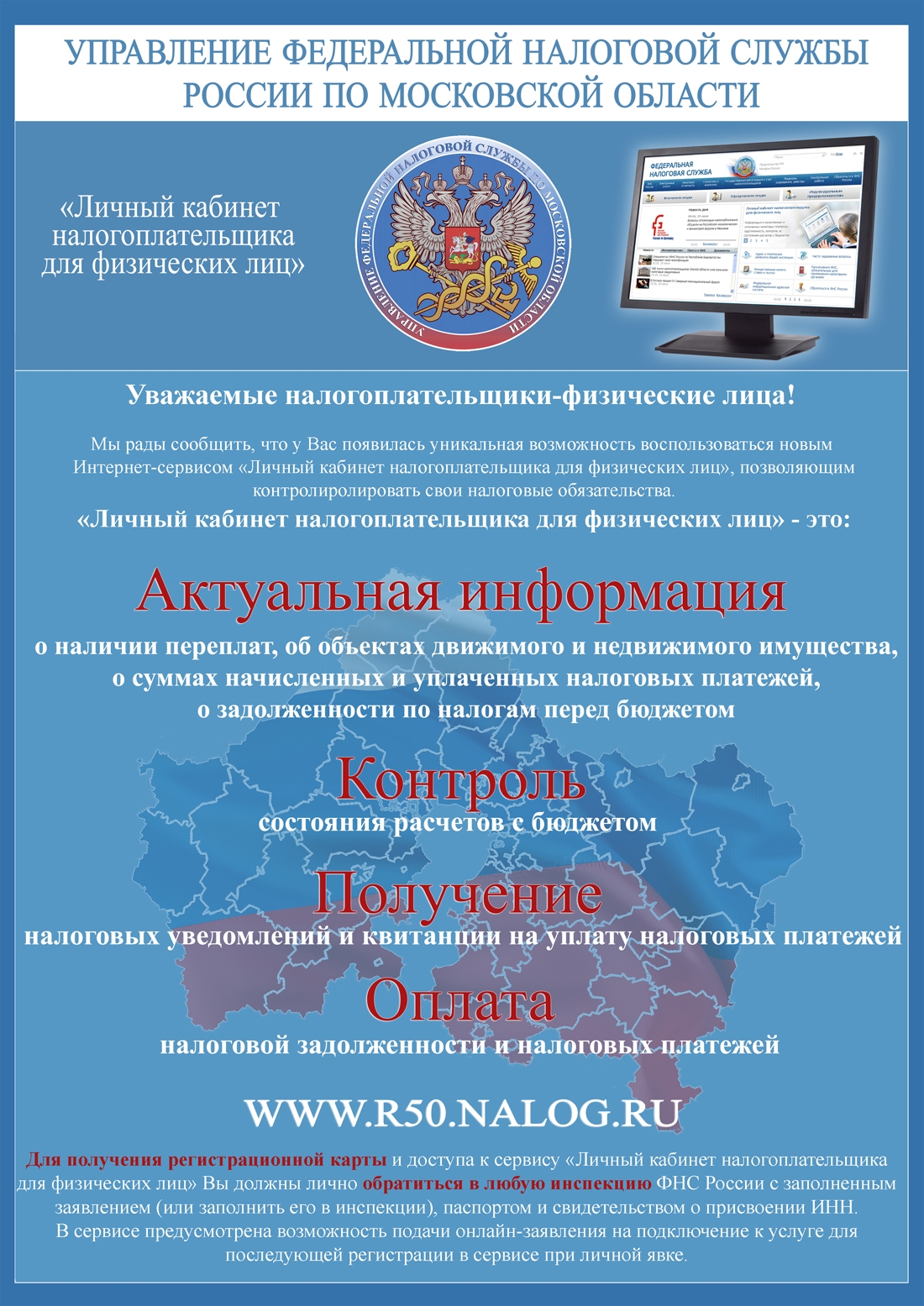 В рамках реализации принципов клиентоориентированного взаимодействия с налогоплательщиками при администрировании имущественных налогов на Интернет-сайте УФНС России по Московской области (http://www.r50.nalog.ru) функционирует Сервис «ИНТЕРАКТИВНАЯ ПРИЁМНАЯ ПО ВОПРОСАМ НАЛОГООБЛОЖЕНИЯ ИМУЩЕСТВА ФИЗИЧЕСКИХ ЛИЦ».
