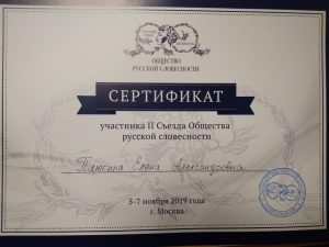 Учитель МОУ гимназии №7 Плюгина Елена Александровна приняла участие в работе II съезда Общества русской словесности, проходившего в Интеллектуальном центре- Фундаментальной библиотеке Московского государственного университета имени М. В. Ломоносова под председательством Патриарха Московского и всея Руси Кирилла.