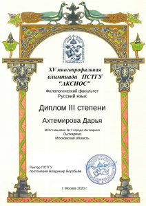 Заочный тур олимпиады состоялся в ноябре-декабре 2019 года и собрал более 2,5 тысяч участников из 63 регионов страны. В январе 2020 года были объявлены победители и призеры заочного тура этой олимпиады. Учащаяся 6 «Г» класса, Ахтемирова Дарья, заняла третье место по русскому языку. Сивова Дарья и Луговкин Владимир, также учащиеся 6 «Г», стали четвертыми. Кроме того, Сивова Дарья и Ахтемирова Дарья, завоевали третье место в олимпиаде по литературе, Луговкин Владимир получил поощрительное четвертое место. Молодцы. Желаем новых творческих побед.