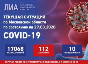 Всего на данный момент 29 марта 2020 год в Подмосковье зарегистрировано 112 случаев заболевания. Из больницы после выздоровления выписаны 10 пациентов.