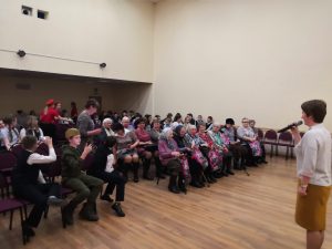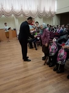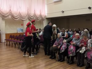 | Гостям был представлен фильм о городе Лыткарино и перспективах его развития, а учащиеся гимназии подготовили небольшой концерт для ветеранов города. Перед вручением наград Константин Николаевич Юшковский обратился к старшему поколению со словами благодарности и сердечно поздравил их с годовщиной Великой Победы. В конце мероприятия юнармейцы гимназии угостили своих гостей масленичными блинами.