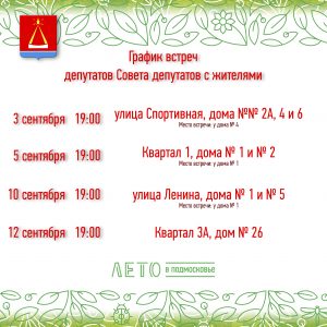 | Сформирован перечень адресов, по которым пройдут встречи депутатов городского округа Лыткарино с жителями, на первую половину сентября. В этот период состоятся 4 собрания. Во внимании народных избранников окажутся дома по улицам Спортивная, Ленина, кварталов 1 и 3А.