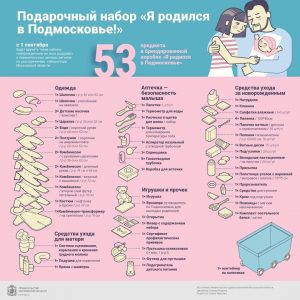| Коробка для новорождённого включает в себя 51 предмет на общую стоимость 20 тысяч рублей. Данный набор можно получить сразу в роддоме, в него также входит свидетельство о рождении, СНИЛС, временный полис ОМС, справка для получения единовременного пособия при рождении ребенка и присвоение номера ИНН. По словам заведующей женской консультацией г.о. Лыткарино Галиной Морозовой, нововведение создано для привлечения мам в родильные дома Московской области. Родильные дома Подмосковья оснащены новым оборудованием, качественным оказанием медицинской помощи женщинам и их новорожденным.
