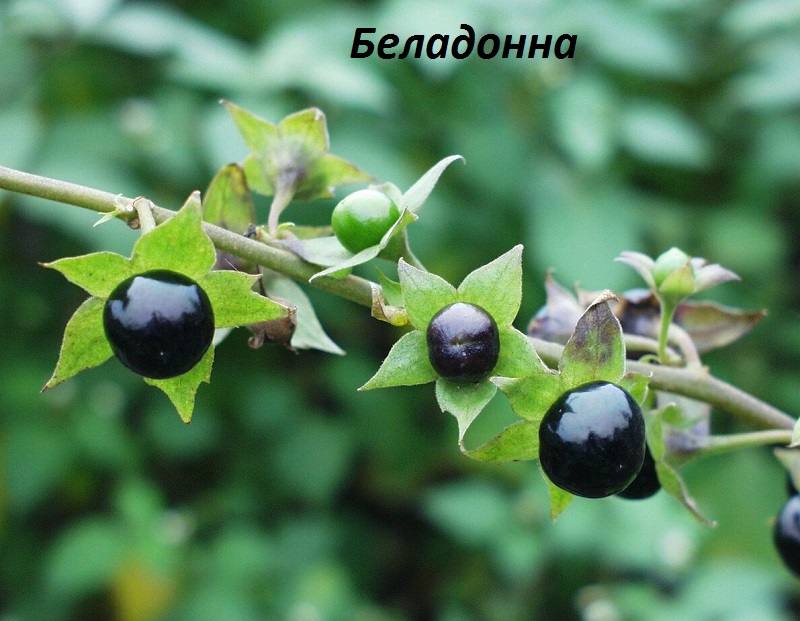 Ежегодно фиксируются случаи отравления беладонной, чьи фиолетово-черные ягоды содержат опасные алкалоиды. Симптомы отравления: тахикардия, сухость в гортани, в тяжелых случаях – потеря ориентации и бред. Необходима срочная помощь медиков. В качестве первой помощи до прибытия врачей рекомендуется вызвать рвоту с помощью раствора соли или большого количества теплой воды, принять активированный уголь.