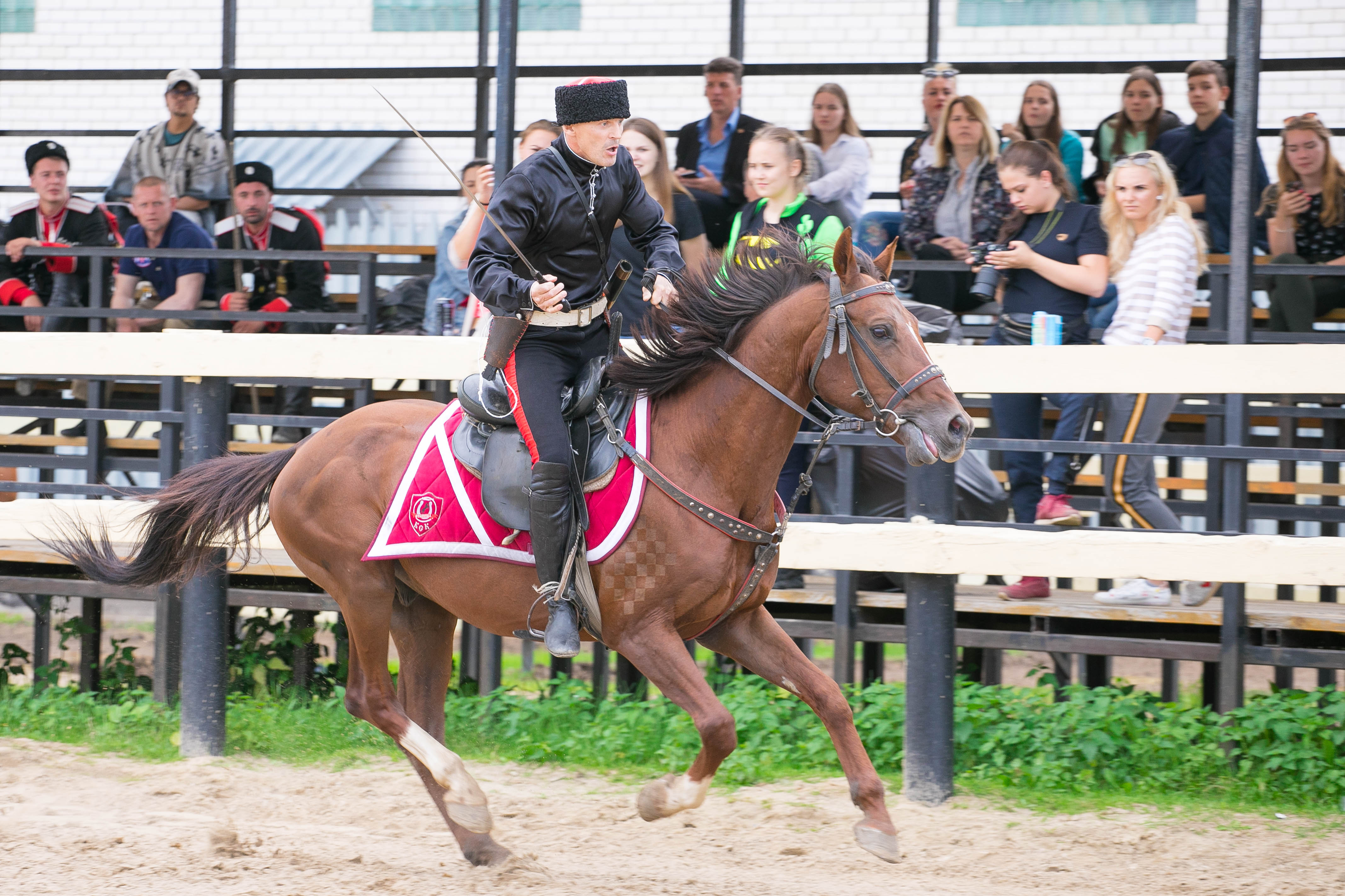 | 34 участника выступили на соревнованиях, показав мастерство верховой езды.Показательные выступления продемонстрировали воспитанники КСК «Созидатель», спортсмены из Кремлёвской школы верховой езды, а также мастера джигитовки из разных уголков России. Соревнования прошли в двух разделах: «Вольная джигитовка» и «Специальная джигитовка». В первом — спортсмены показали высокий уровень выполнения гимнастических и акробатических трюков. А во второй части соревнований участники продемонстрировали мастерство владения оружием. После подведения официальных результатов победителем абсолютного первенства по двум разделам стал Александр Лещёв, второе место занял Юрий Доботолов, а бронзовые награды завоевал Денис Щеглов.