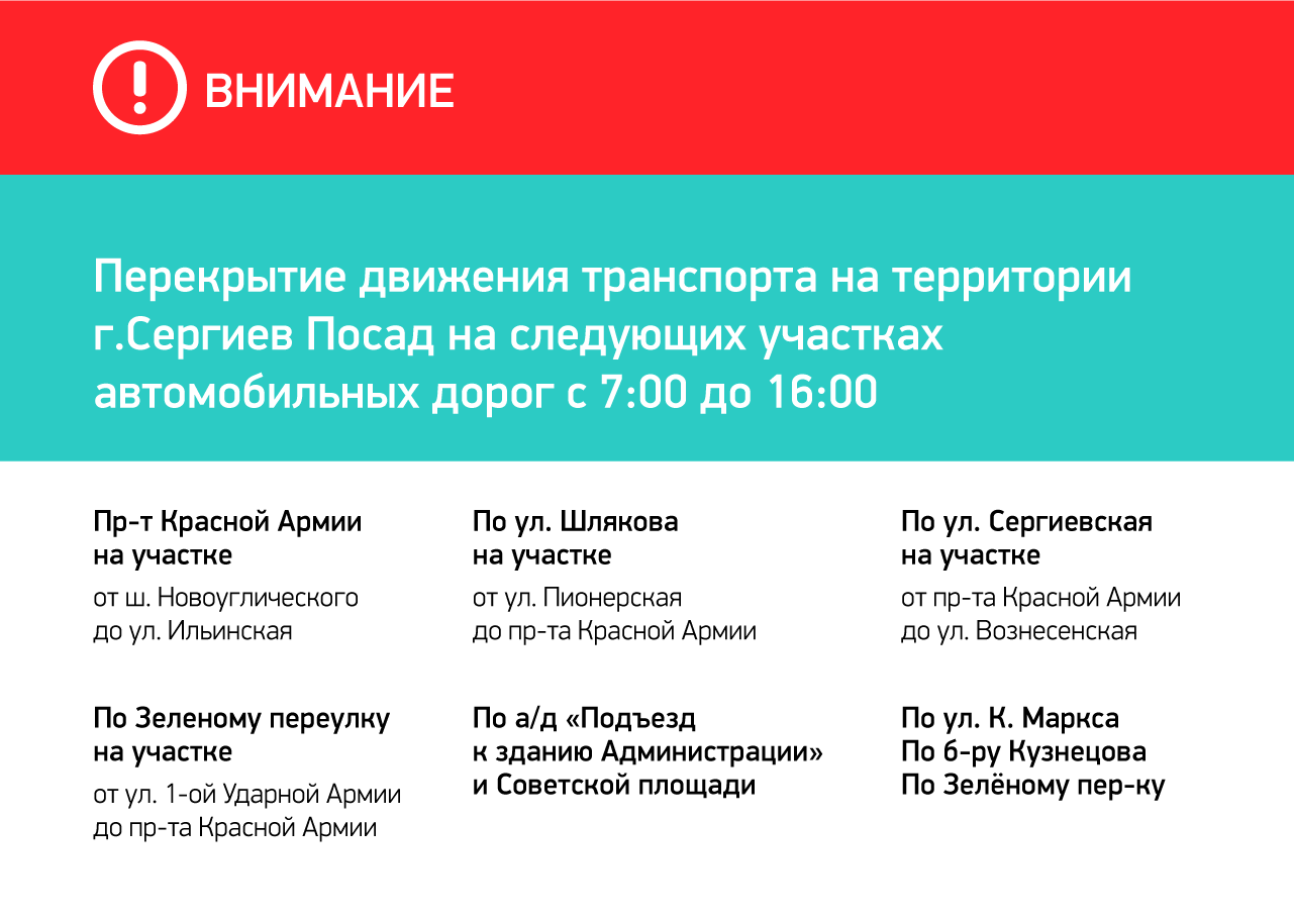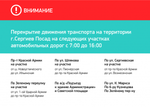 В связи с проведением забега «Сергиевым Путем» 20 июля в период с 7 до 16 часов будет перекрыто движение транспорта на территории города Сергиев Посад. Движение будет перекрыто на следующих участках дорог: