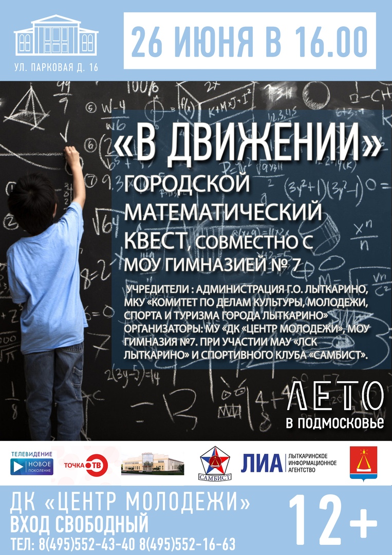 | Отправь заявку на нашу почту mclytkarino@list.ru ( письмо с пометкой «В ДВИЖЕНИИ» ), где нужно указать свое ФИО, возраст, контактный телефон. Период подачи: с 20 по 25 июня 2019 года. Тебя ждут призы от МАУ «ЛСК Лыткарино» и Спортивного клуба «Самбист». Количество мест ограничено!