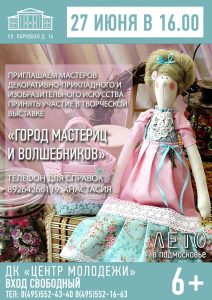 | Мастера, занимающиеся декоративно-прикладным или изобразительным искусством, могут продемонстрировать свои работы жителям всего города. В четверг 27 июня в 16:00 откроется выставка авторских работ «Город мастериц и волшебников».