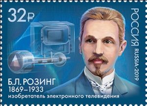На почтовой марке изображён портрет Б.Л. Розинга на фоне модели приёмной электронно-лучевой трубки и телевизионного приёмника «КВН-49».