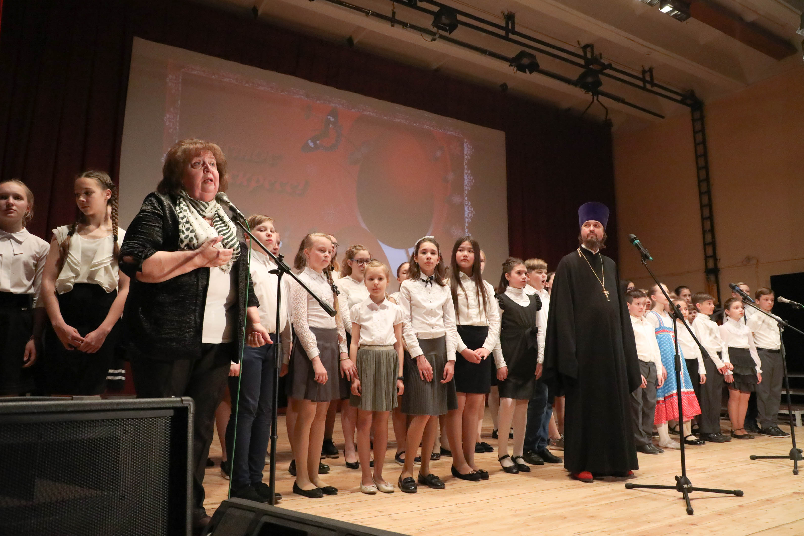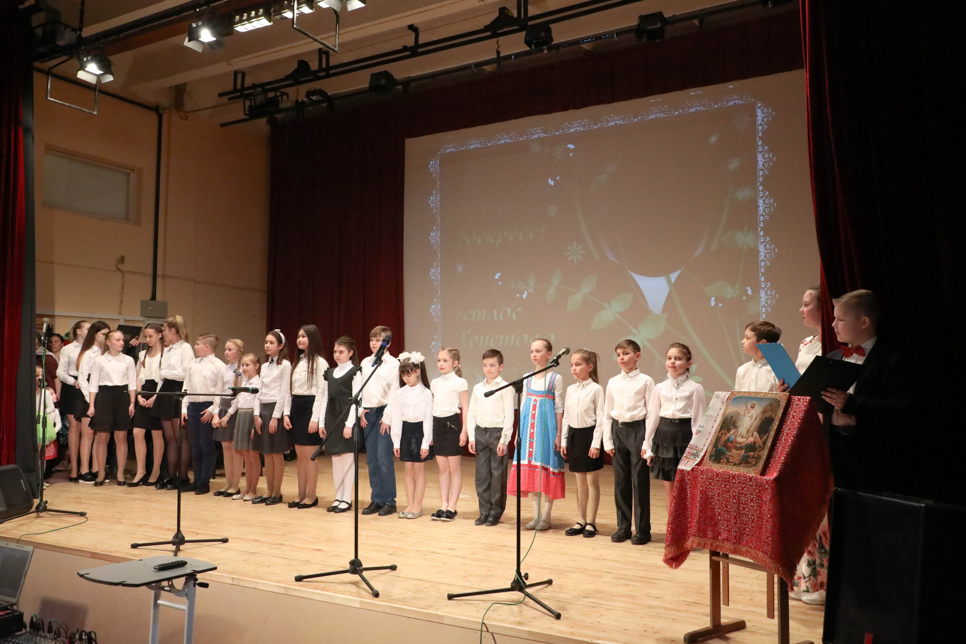 | 5 мая в главном зале Детской музыкальной школы собрались сводные хоры. Ребята исполнили для родителей и друзей самые нежные и теплые музыкальные композиции, стихотворения и оперные постановки. С праздником великой Пасхи со сцены детей и родителей поздравил настоятель храма Рождества Пресвятой Богородицы — Иоанн Шередекин.