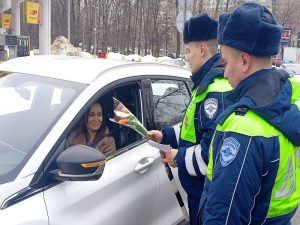 Госавтоинспекторы останавливали автомобили, за рулем которых были женщины, и вместо привычной проверки документов женщины получали от сотрудников полиции праздничные букеты и поздравительные открытки.