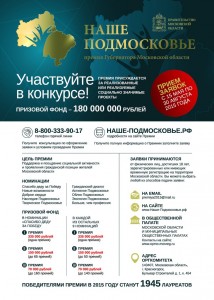 | Начался приём заявок на участие в ежегодной премии Губернатора Московской области «Наше Подмосковье». По возникающим вопросам подачи заявки можно обращаться координатору рабочей группы: 8-916-435-38-44 или tts-7@mail.ru (Тимашкова Татьяна Сергеевна)