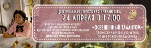 | Центральная городская библиотека и клуб библиотекарей «СВЕТОЧ» приглашает жителей города Лыткарино на творческий вечер, посвященный 150-летию со дня рождения русского живописца Валентина Александровича Серова. О жизни и творчестве выдающего художника расскажет гость библиотеки — методист кафедры русского языка Московской государственной консерватории имени П.И.Чайковского Федорова Ирина Борисовна. Далее…