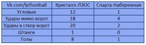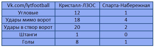 | 22 августа пятничным вечером на стадионе «Полёт» скрестили бутсы футболисты команд «Спарта-Набережная» и «Кристалл-ЛЗОС». Результат игры был, достаточно, предсказуем, поэтому внимание нашей редакции сконцентрировалось на статистике. Итак, обо всем по порядку… На пятой минуте матча Артем Гришкин длинным пасом со своей половины поля вывел один на один Илью Сюткина, и тот СМОГ реализовать момент, открыв счет в игре. Артем Гришкин навесил с фланга, Евгений Полянский не сильно пробил в сторону ворот и мяч, все-таки, закатился в ворота. После ошибки вратаря «Спарты» гол забил Илья Сюткин. За фол против Артема Павлова судья Кирилл Петров назначил пенальти в ворота «Спарты», реализовал который Артем Гришкин. После удара Алексея Яшина мяч ударился о защитника и взмыл вверх, первым взлететь к мячу успел Артем Павлов, сделав счет 5-0. Во втором тайме Андрей Светлов навесил в штрафную, где проворнее всех оказался Евгений Полянский. За фол против Евгения Полянского был назначен второй пенальти в ворота «Спарты», реализовал который вратарь «Кристалла» Павел Селезнёв. Алексей Чернышев промчался по флангу и выдал пас Андрею Дегаеву, из ног которого пробил Денис Феофанов, размочив кристалловские ворота. За фол против Артема Павлова был назначен третий пенальти в ворота «Спарты», реализовал который сам пострадавший. 8-1 победил «Кристалл». И немного статистики… Далее…