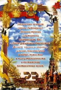 21 февраля в Лыткарине прошли торжественные мероприятия, посвященные предстоящему Дню защитника отечества. В 13:30 на площади ДК «Мир» состоялась церемония возложения цветов к скульптурной композиции «Слава защитникам отечества». Далее во Дворце культуры, в рамках праздничного концерта, зрители смогли услышать песни, посвященные защитникам отечества. Собравшихся поздравил Глава города Евгений Серёгин, Председатель Совета депутатов Василий Дерябин и Председатель Совета ветеранов войны и труда Айказ Багдасарян. Далее…