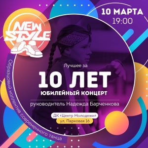 10 марта на сцене ДК «Центр Молодежи» состоится юбилейный концерт Образцового коллектива современного танца «New Style». Руководит коллективом Надежда Барченкова.