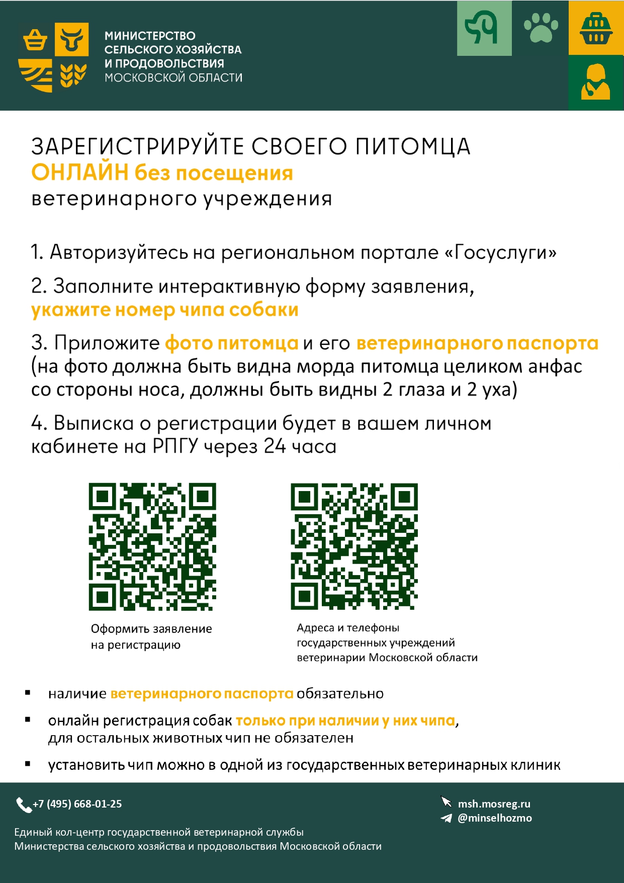 Министерство сельского хозяйства и продовольствия Московской области сообщает, что меняется для владельцев животных. Теперь вся процедура регистрации проводится дистанционно через Портал государственных и муниципальных услуг Московской области. Это позволяет экономить время и силы владельцам. Зарегистрировать животных теперь могут не только граждане, но и различные организации: питомники, садоводческие товарищества (СНТ), гаражные кооперативы, предприятия и индивидуальные предприниматели.