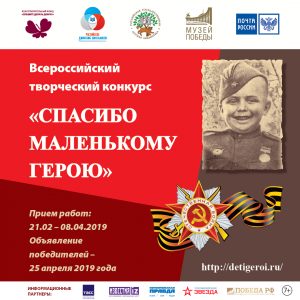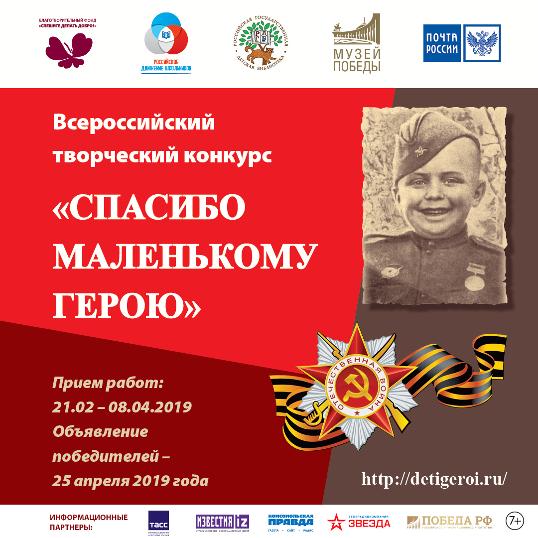 | 21 февраля 2019 года открывается прием заявок на Всероссийский творческий конкурс «Спасибо маленькому герою», который проводит фонд Оксаны Федоровой «Спешите делать добро!» и Почта России в сотрудничестве с Российским движением школьников, Российской государственной детской библиотекой и Музеем Победы.