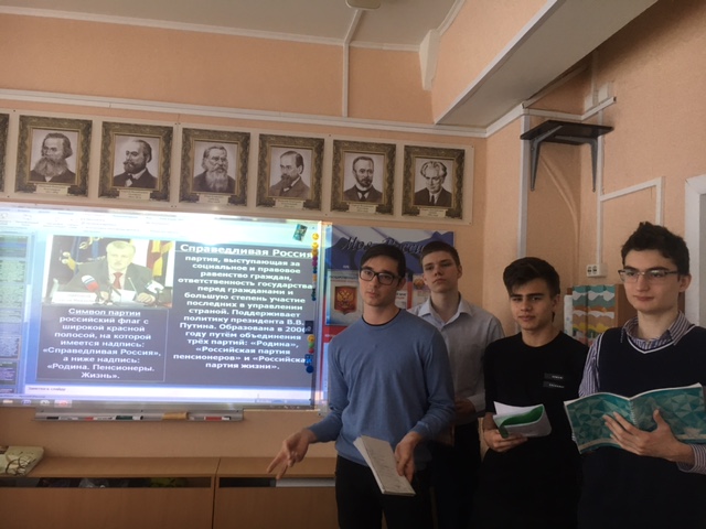 | Учащиеся заранее были разделены на команды, каждая из которых представляла свою избирательную программу. Ребята подошли к заданию творчески. Они не только изучили имеющиеся программы, но и выдвигали новые задачи, предлагали решения проблем и источники их осуществления. После представления своих партий (Единая Россия, КПРФ, ЛДПР, Справедливая Россия), в классе разгорелись дебаты по различным пунктам программ. Урок прошел информативно, живо и достаточно интересно.