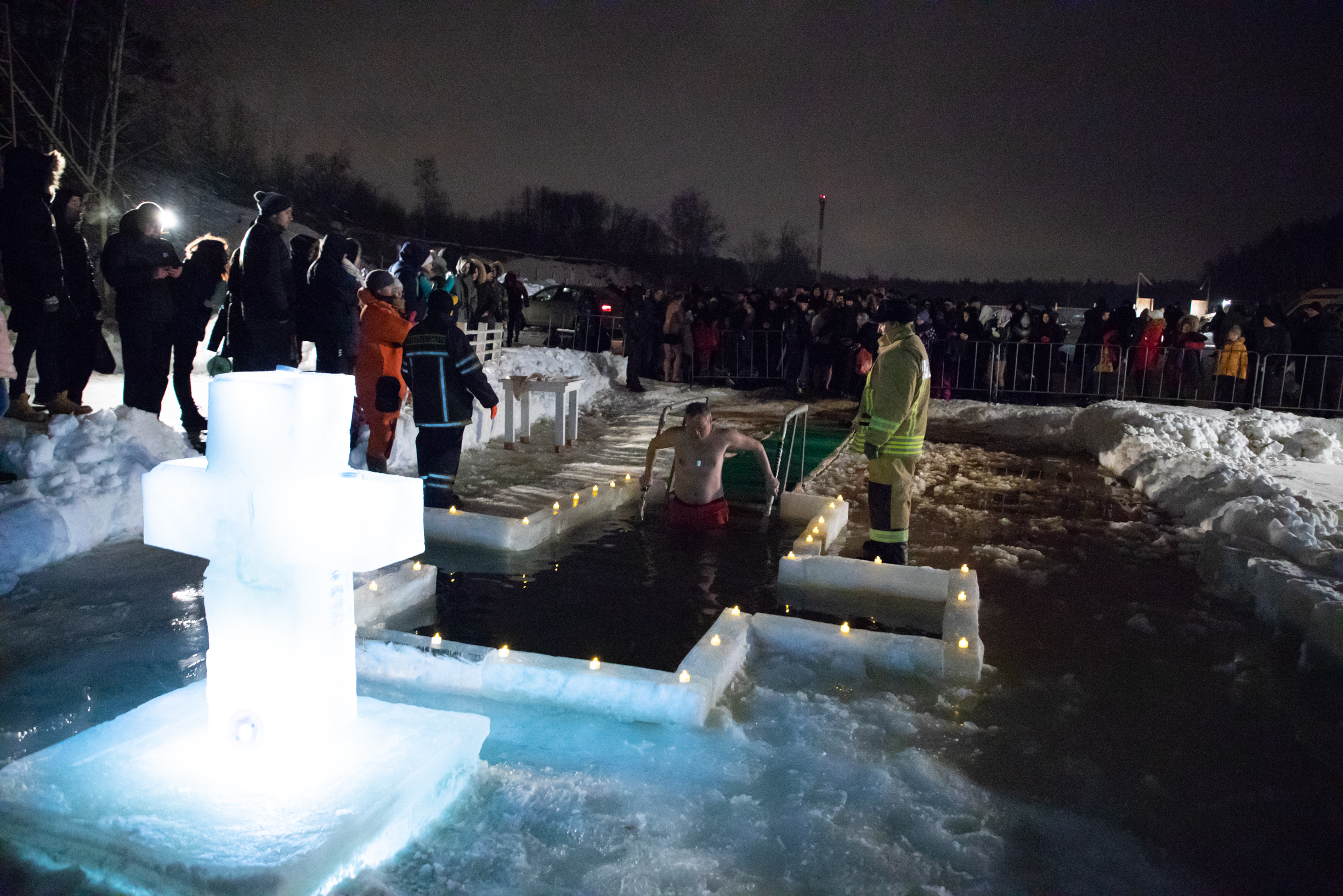 | Жители Лыткарина отметили праздник Крещения Господня, также называемого Богоявлением, в ночь с 18 на 19 января. На карьере «Волкуша» собралось более 500 горожан, чтобы принять участие в торжественной молитве и окунуться в священную воду. Специально для того, чтобы лыткаринцы смогли приобщиться к великому празднику, во льду карьера была вырублена иордань, дно которой было предварительно обследовано водолазной командой. Общую молитву и освящение воды возглавил настоятель Елисаветинского больничного храма отец Александр, который также поздравил всех присутствующих с наступлением Крещения и рассказал об историю и сакральном смысле праздника для всех христиан. На месте проведения мероприятия дежурили сотрудники экстренных служб и водолазы, также были оборудованы отапливаемые раздевалки.