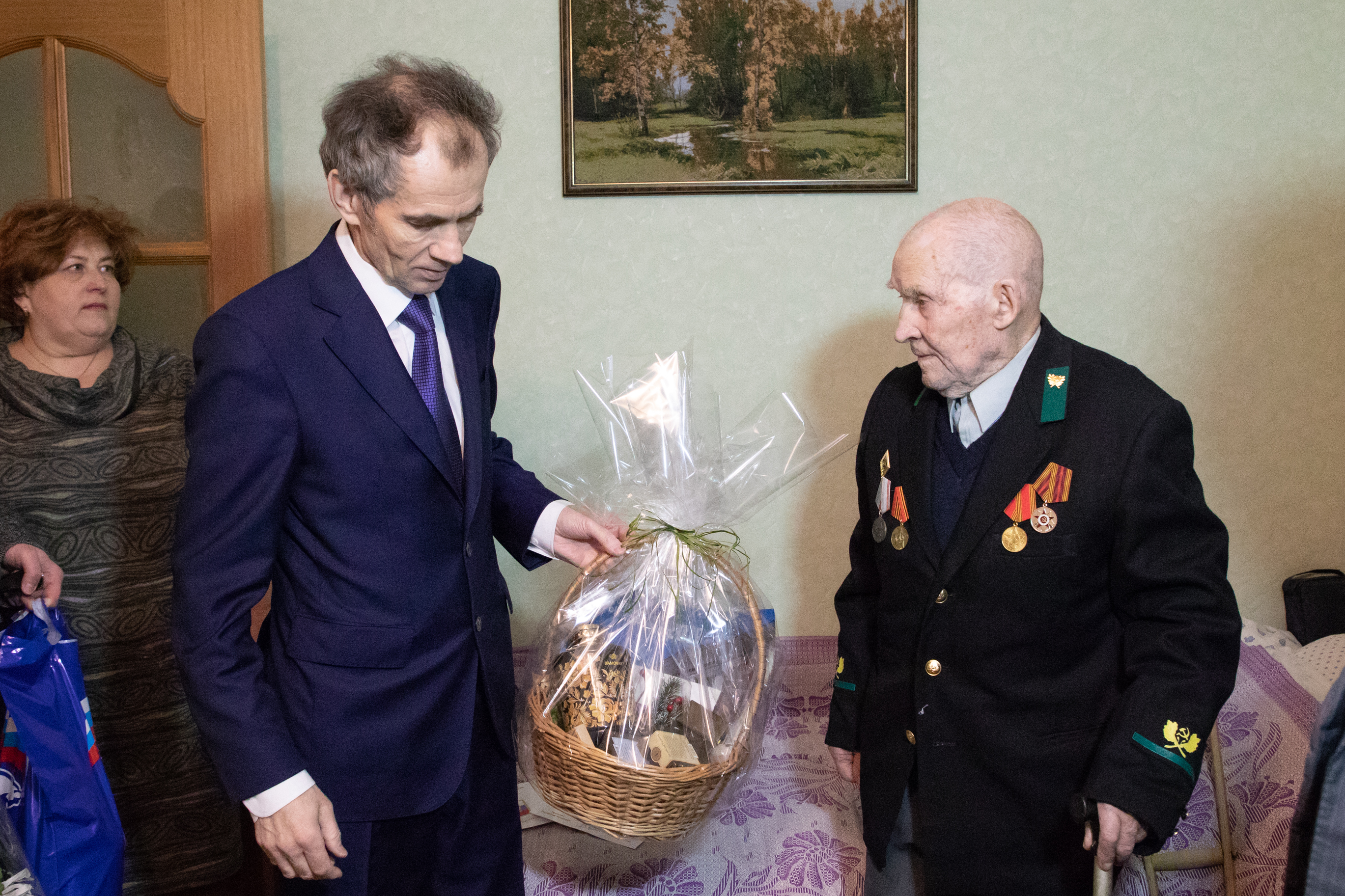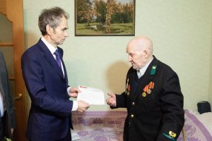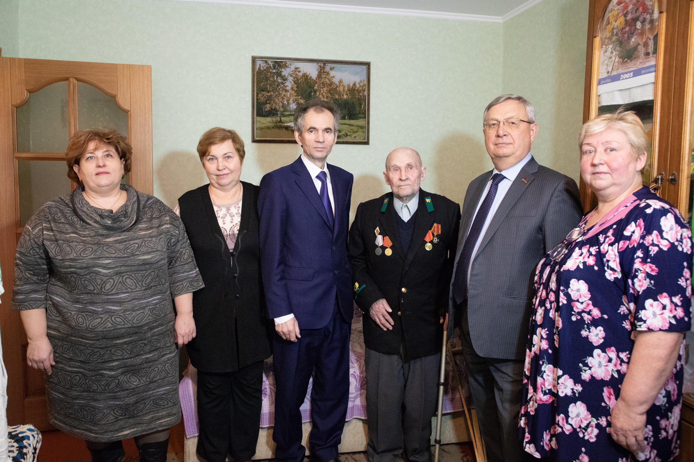 | Глава города Евгений Серёгин и Председатель Совета депутатов Василий Дерябин поздравили с 90-летним юбилеем Ветерана Великой Отечественной Войны, Ветерана труда, профсоюзного и общественного деятеля, военного радиста малых и больших мощностей 1 класса Матвеева Василия Фомича. Евгений Серёгин вручил Ветерану поздравительное письмо Президента России и подарки. Гости побеседовали с Василием Фомичём о войне, тяжелой послевоенной жизни нашей страны. У Василия Фомича большая и дружная семья – он имеет трёх дочерей, одного сына, трёх внучек, одного внука и правнука.