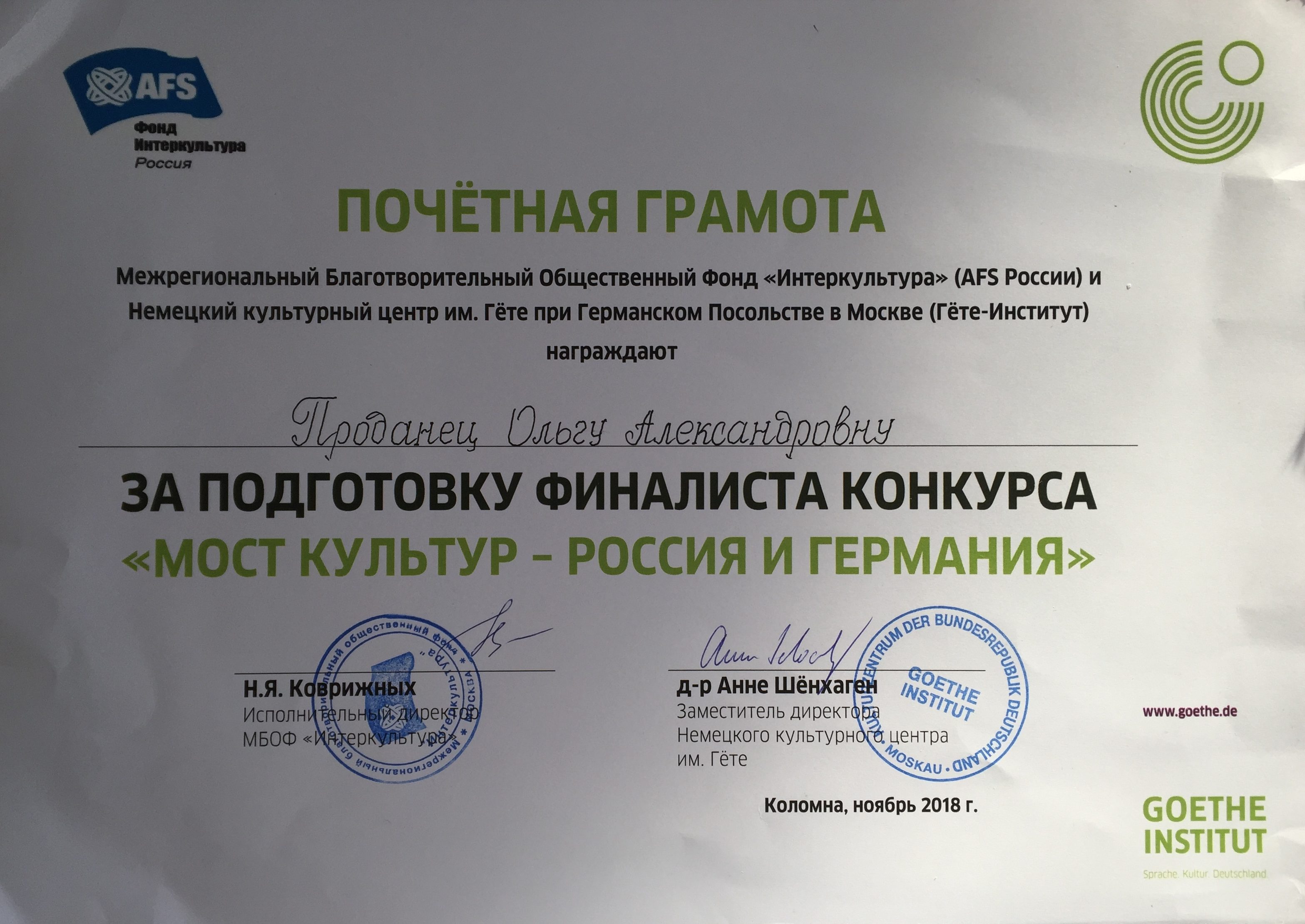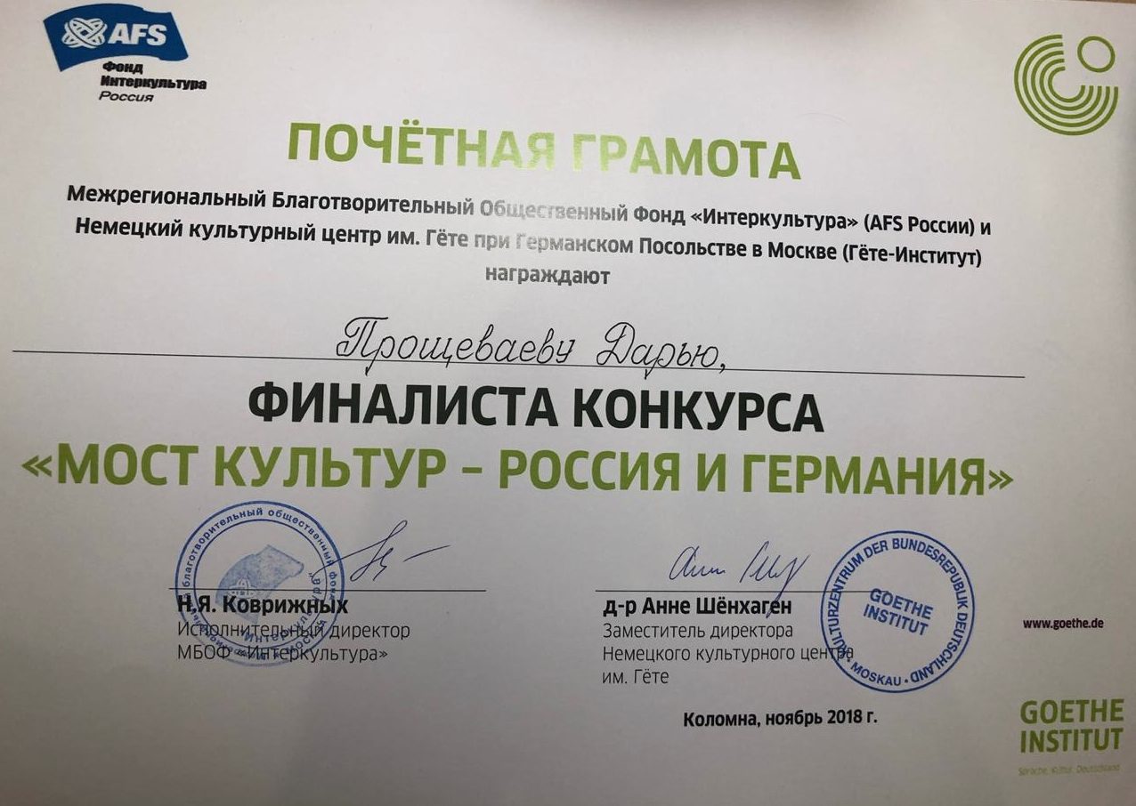 | В городе Коломна с 10 по 13 ноября проходил Всероссийский конкурс по немецкому языку «Мост культур – Россия и Германия 2019», в котором приняла участие Прощеваева Дарья, учащаяся 10 «В» класса МОУ гимназии №7.