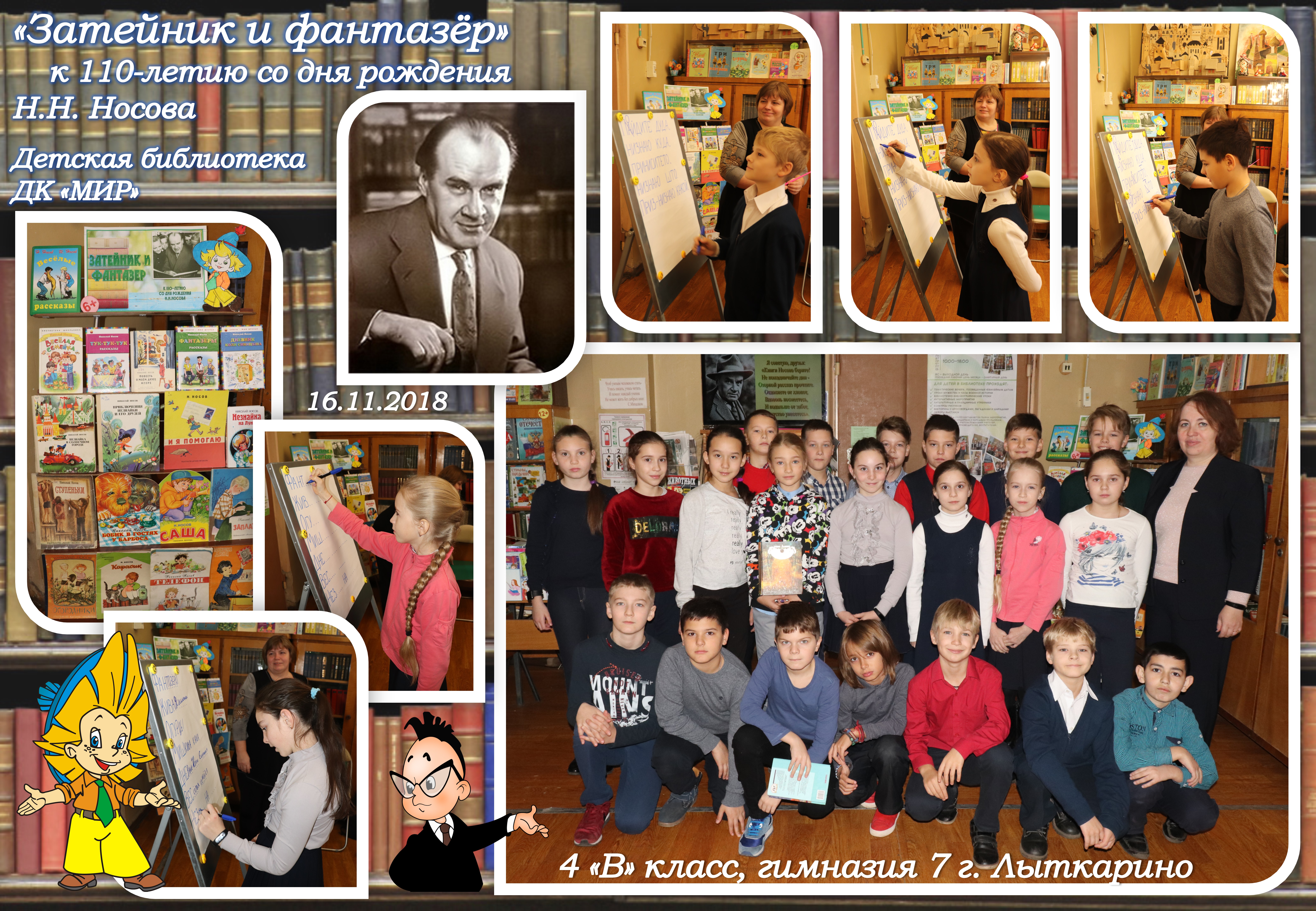 Учащиеся 4 «В»класса МОУ гимназии №7 в Детской библиотеке ДК «Мир» на выставке «Затейник и фантазёр» к 110-летию со дня рождения Н.Н.Носова