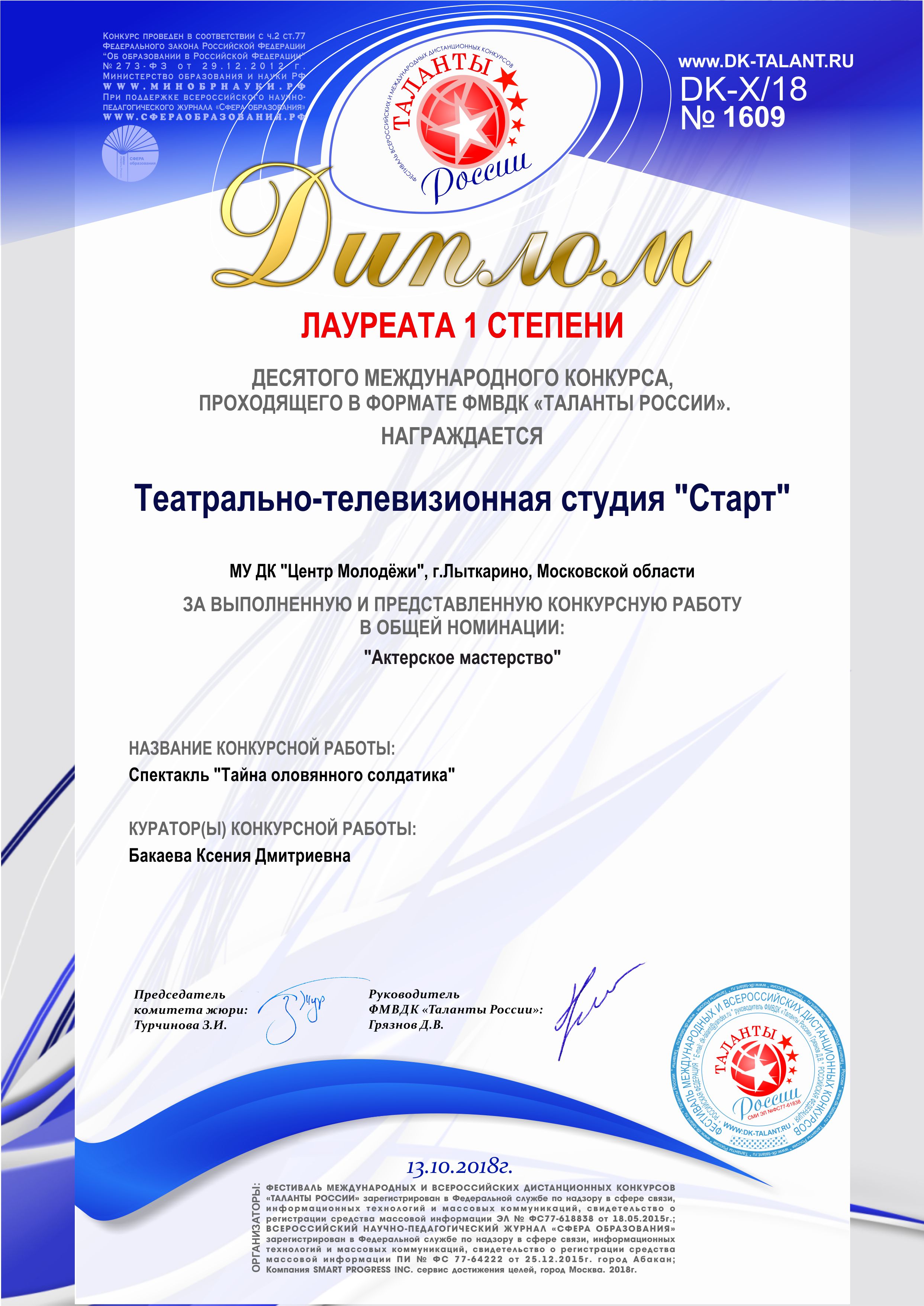 Спектакль «Тайна оловянного солдатика» принёс Театрально-телевизионной студии «Старт» звание Лауреата I степени на десятом Международном и Всероссийском конкурсе «Таланты России» в номинации «Актёрское мастерство».