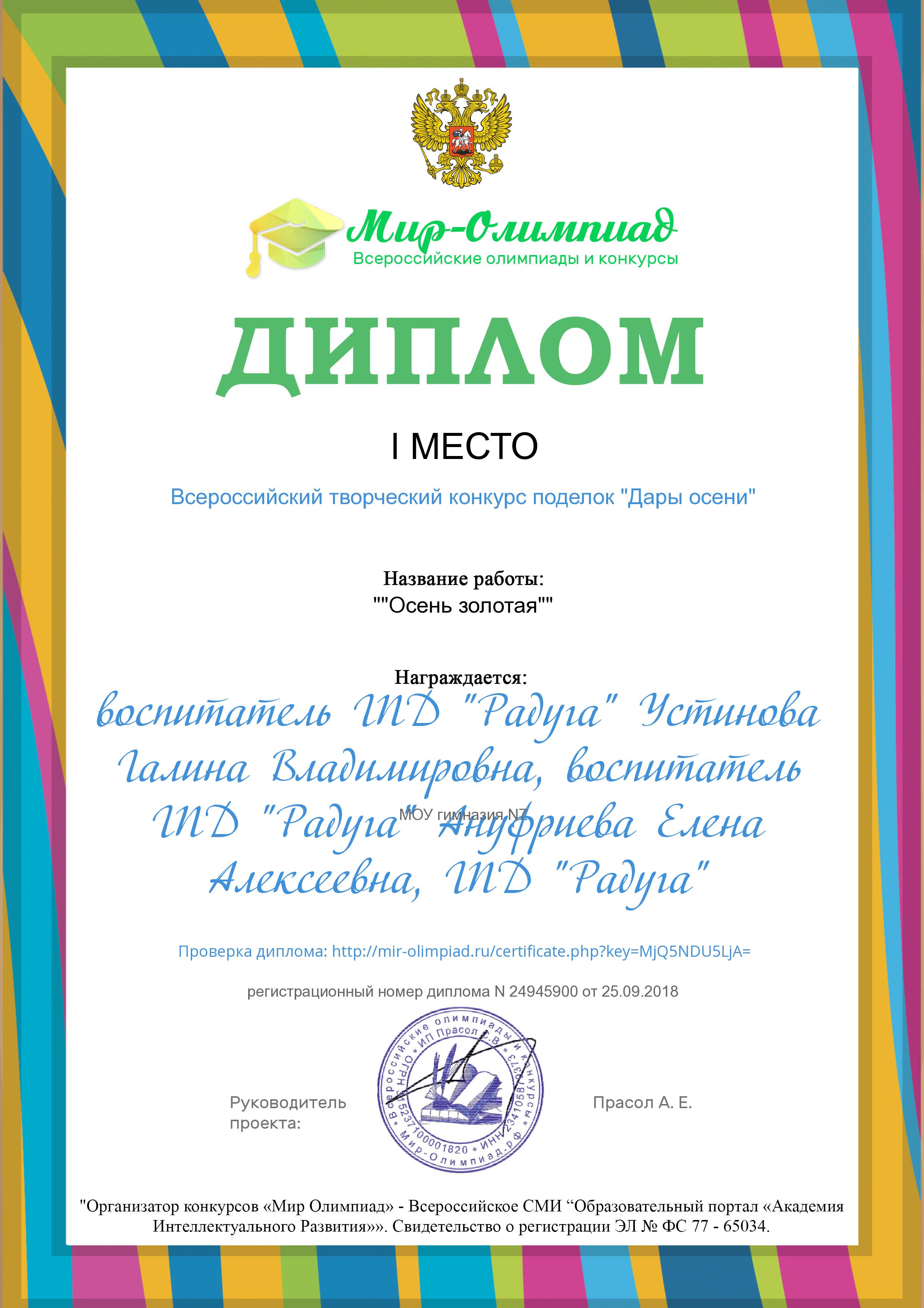 | Первоклассники МОУ гимназии №7 успешно начали учебный год!! Прошел всего месяц, а они со своими педагогами, Устиновой Галиной Владимировной и Ануфриевой Еленой Алексеевной, занимаясь в Группе Продлённого Дня «Радуга», уже успели сделать много интересных работ и отправить на конкурсы. И вот первые дипломы участников и победителей! Поздравляем!!! Здорово. Это хорошее начало.Так держать!Удачи вам и новых творческих побед!!!