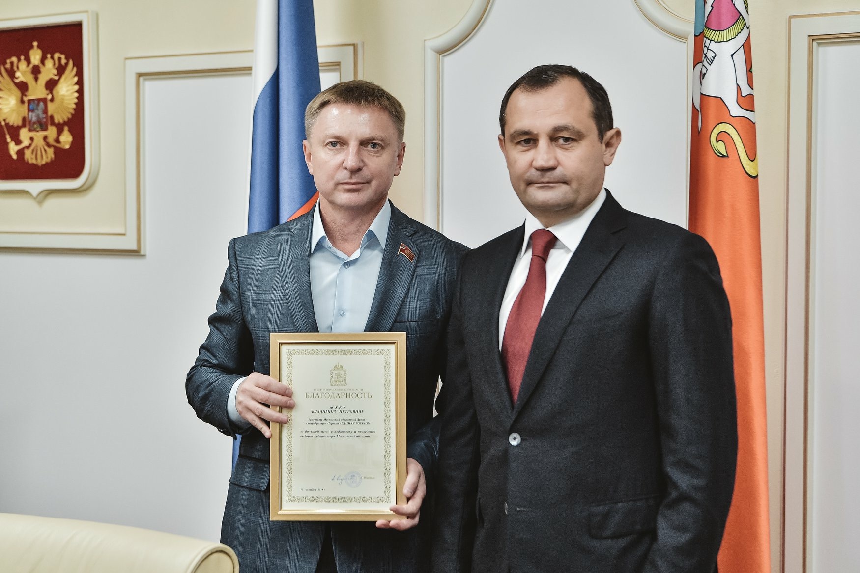 | Председатель Московской областной думы Игорь Брынцалов вручил награды губернатора Подмосковья Андрея Воробьева 15-ти депутатам, наиболее отличившимся во время проведения избирательной кампании по выборам губернатора Подмосковья. В числе награждённых – депутат регионального парламента, избранный по нашему округу, Владимир Жук.