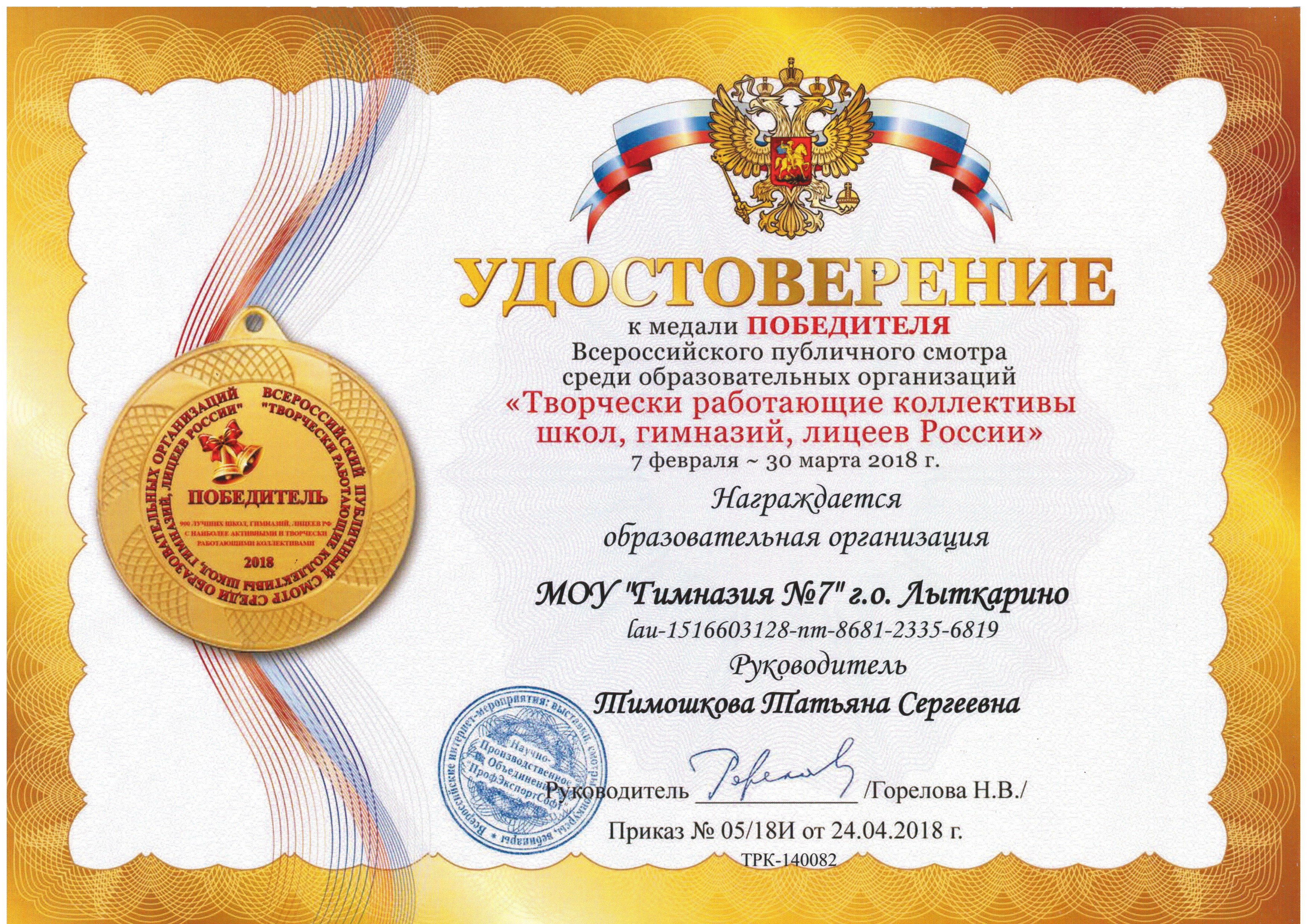 МОУ гимназия №7 г. Лыткарино стала победителем «Всероссийского публичного смотра среди образовательных организаций «Творчески работающие коллективы школ, гимназий, лицеев России»