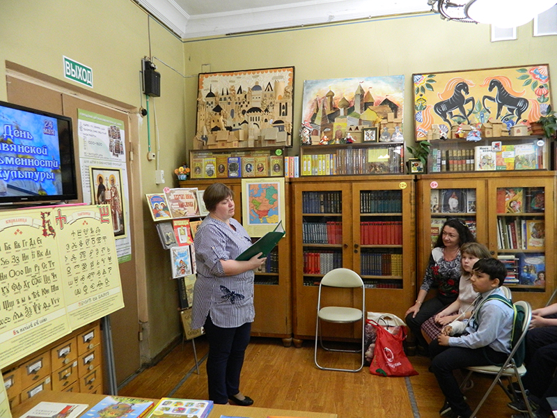 | 23 мая в детском отделе Городской библиотеки ДК «Мир» для учеников 3 «Г» класса гимназии №7 был проведен библиотечный урок «Звучат лишь Письмена», посвященный Дню славянской письменности и культуры.