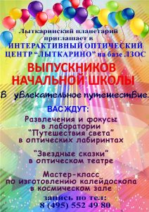 | Уважаемые родители! Подходит к концу учебный год. Наверняка многие из Вас уже думают, как организовать детям интересный и запоминающийся праздник! Планетарий Лыткаринского музея предлагает увлекательную программу в Интерактивном оптическом центре «Лыткарино» с детской обсерваторией на базе АО «ЛЗОС».
