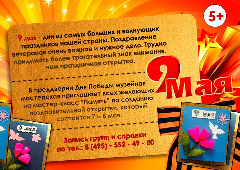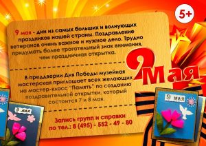 | 9 мая — дин из самых больших и волнующих праздников нашей страны. Поздравление ветеранов очень важное и нужное дело. Трудно придумать более трогательный знак внимания, чем праздничная открытка. В преддверии Дня Победы музейная мастерская приглашает всех желающих на мастер-класс «Память» по созданию поздравительной открытки, который состоится 7 и 8 мая.