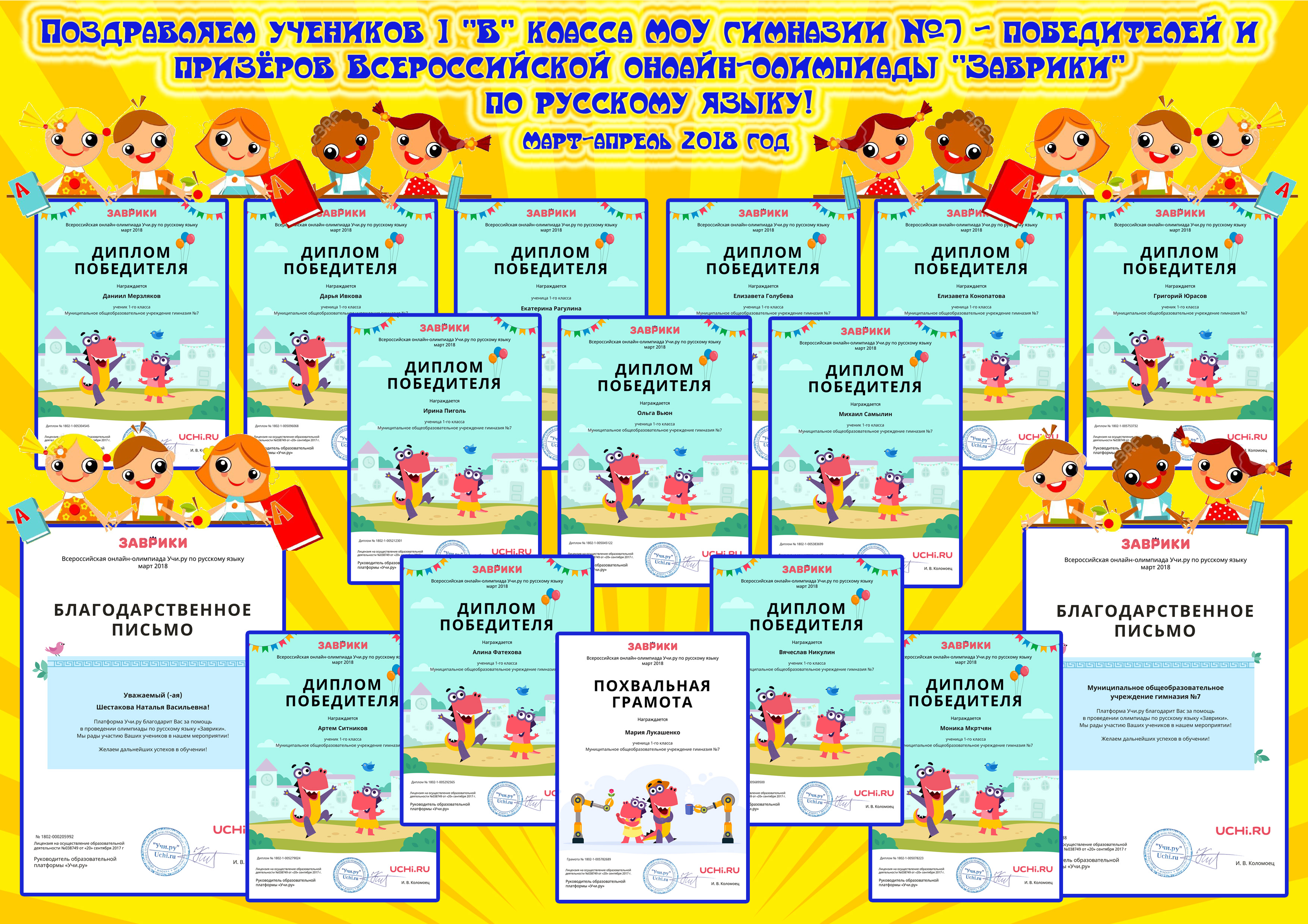 Поздравляем учащихсмя 1 «В» класса МОУ гимназии №7 — победителей и призёров Всероссийской олимпиады «Заврики» по русскому языку!