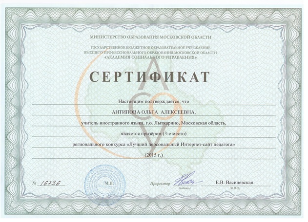 | Подведены итоги регионального конкурса «Лучший персональный Интернет – сайт педагога», проводимого ГБОУ ВПО МО «Академией социального управления». В нем приняла участие учитель иностранного языка МОУ гимназии №7 Антипова Ольга Алексеевна. Далее…