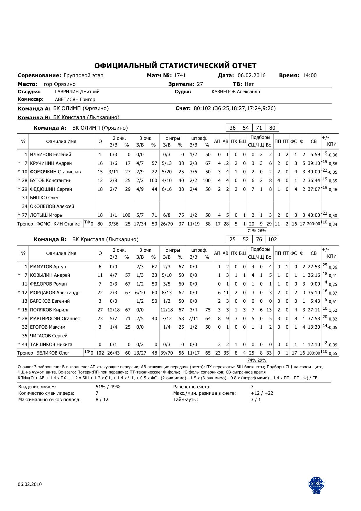 | 7 февраля в рамках первенства Московской области по баскетболу среди мужских команд БК «Кристалл» играл на выезде во Фрязино против команды «Олимп». В игре первых составов наша команда уступала в первой половине матча, но смогла собраться и добавить в 3 и 4 четвертях, победив со счетом 102-80. Игра второго состава была не столь убедительна, как обычно. Наши резервисты уступили со счетом 67-58.