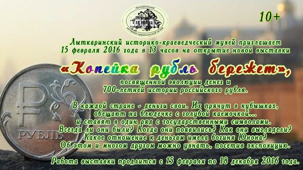 | Лыткаринский музей приглашает всех желающих посетить новую музейную выставку «Копейка рубль бережет», посвященную 700-летнему юбилею российского рубля. Впервые рубль появился в письменных источниках как денежная единица в 1316 году. В 2016 году исполнится ровно 700 лет с того момента, как рубль стал символом нашей страны. Об истории появления денег, о том, как они выглядели и о многом другом вы сможете узнать, посетив экспозицию. Выставка откроется 15 февраля 2016 года в 13:00. Ждем вас по адресу: г. Лыткарино, ул. Коммунистическая, д. 10 (выставочный зал музея). Запись групп и справки по тел.: 8-495-552-49-80.