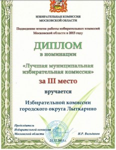 | 23 декабря 2015 г. Избирательная комиссия Московской области на своем очередном заседании по подведению итогов работы избирательных комиссий Московской области в 2015 г. вручила Диплом в номинации «Лучшая муниципальная комиссия» за III место Избирательной комиссии городского округа Лыткарино.