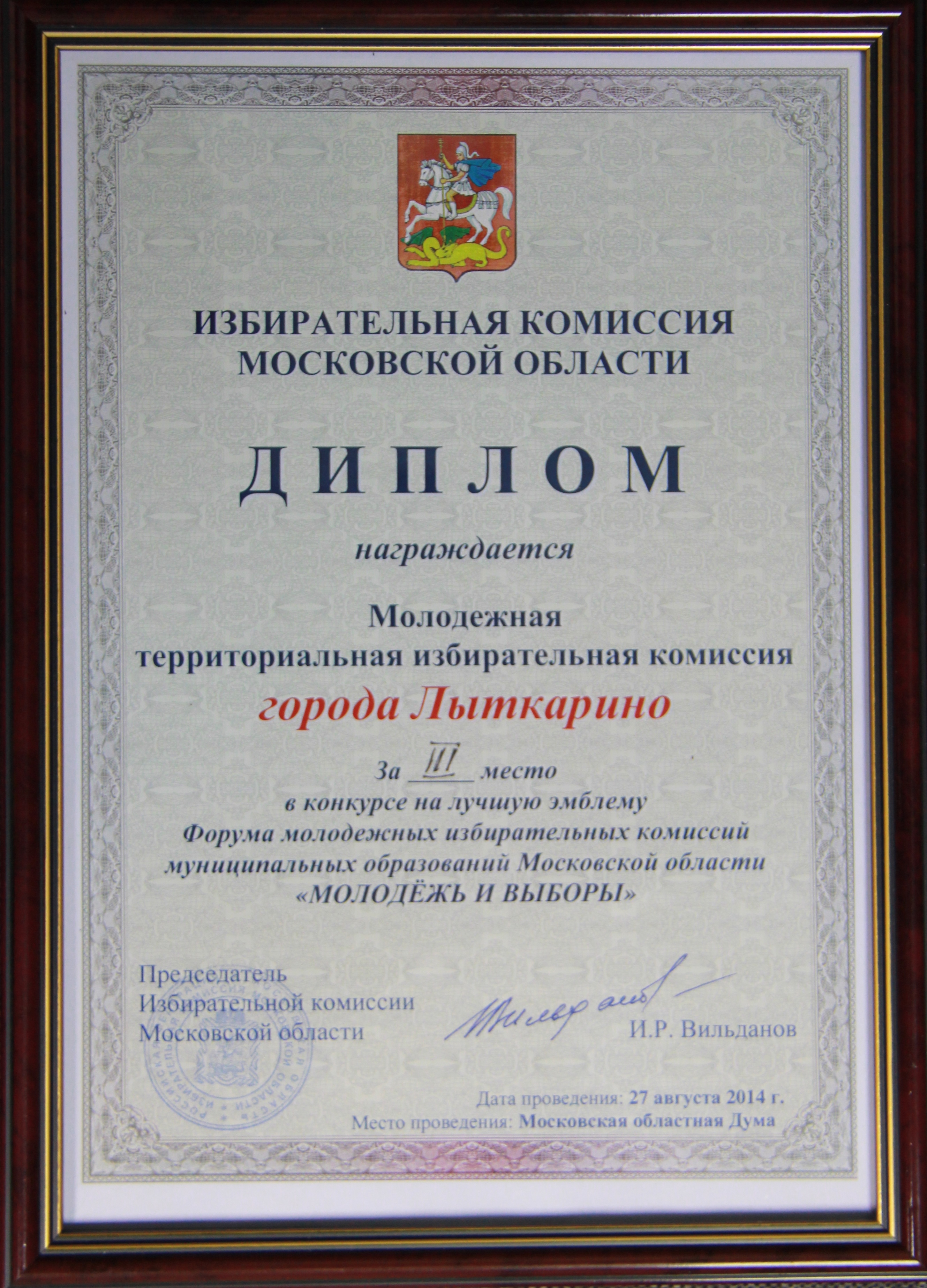 | Молодежная избирательная комиссия Московской области 1 августа 2014 г. объявила конкурс на лучшую эмблему Форума молодежных избирательных комиссий Московской области «Молодежь и выборы». В данном конкурсе приняли участие 36 молодежных избирательных комиссий Московской области, в том числе молодежная территориальная избирательная комиссия города Лыткарино. На Форуме молодежных избирательных комиссий Московской области «Молодежь и выборы», который состоялся в Московской областной Думе 27 августа 2014 г., проходило голосованию по определению эмблемы Форума. В результате голосования молодежная территориальная избирательная комиссия города Лыткарино была награждена дипломом Избирательной комиссии Московской области за III место в конкурсе на лучшую эмблему Форума молодежных избирательных комиссий Московской области «Молодежь и выборы». Далее…