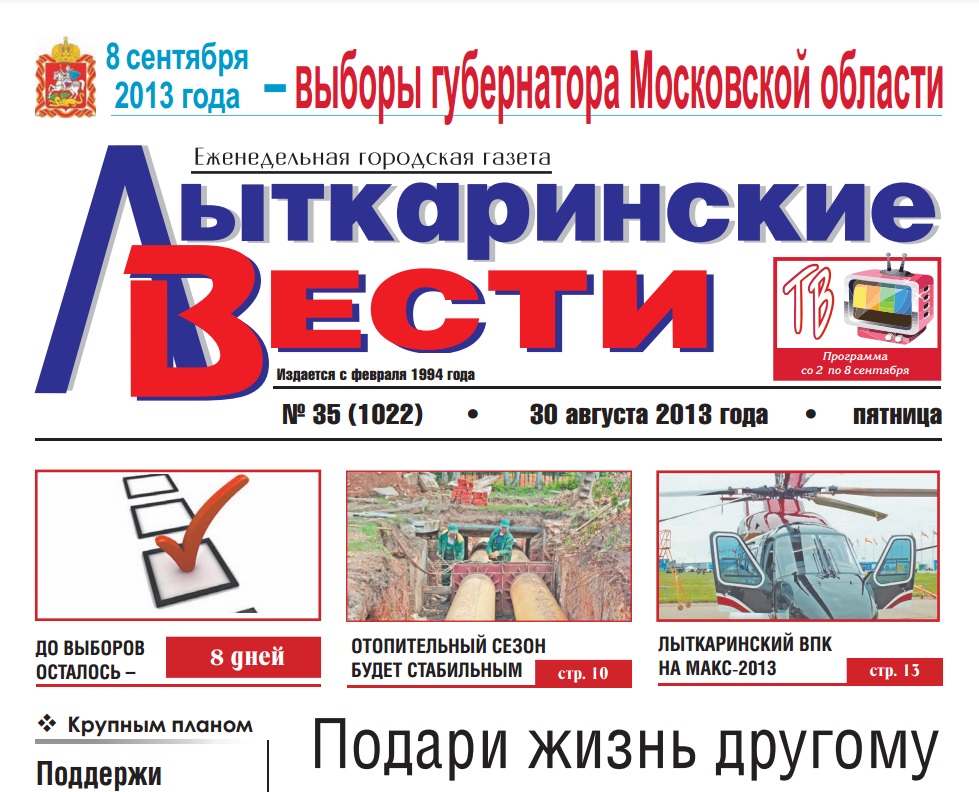 Газета “Лыткаринские вести”, выпуск № 35 от 29.08.2013 года.