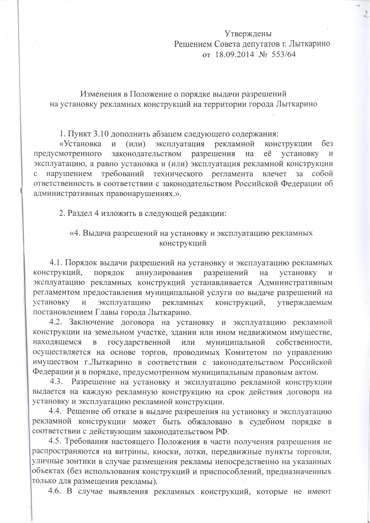 О внесении изменений в положение о порядке выдачи разрешений на установку рекламных конструкций на территории города Лыткарино Московской области