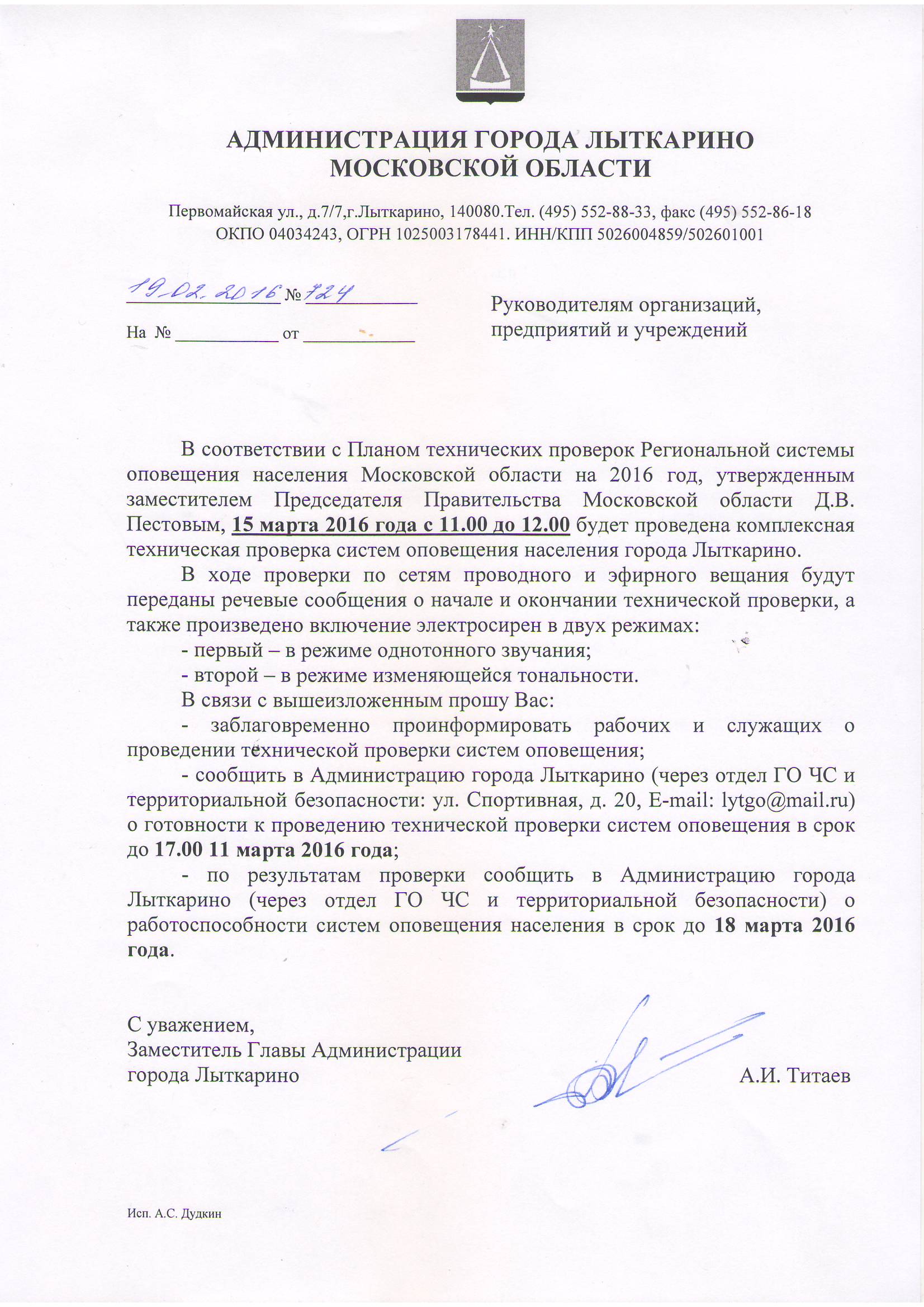 В соответствии с Планом технических проверок Региональной системы оповещения населения Московской области на 2016 год, утвержденным заместителем Председателя Правительства Московской области Д.В. Пестовым, 15 марта 2016 года с 11.00 до 12.00 будет проведена комплексная техническая проверка систем оповещения населения города Лыткарино.