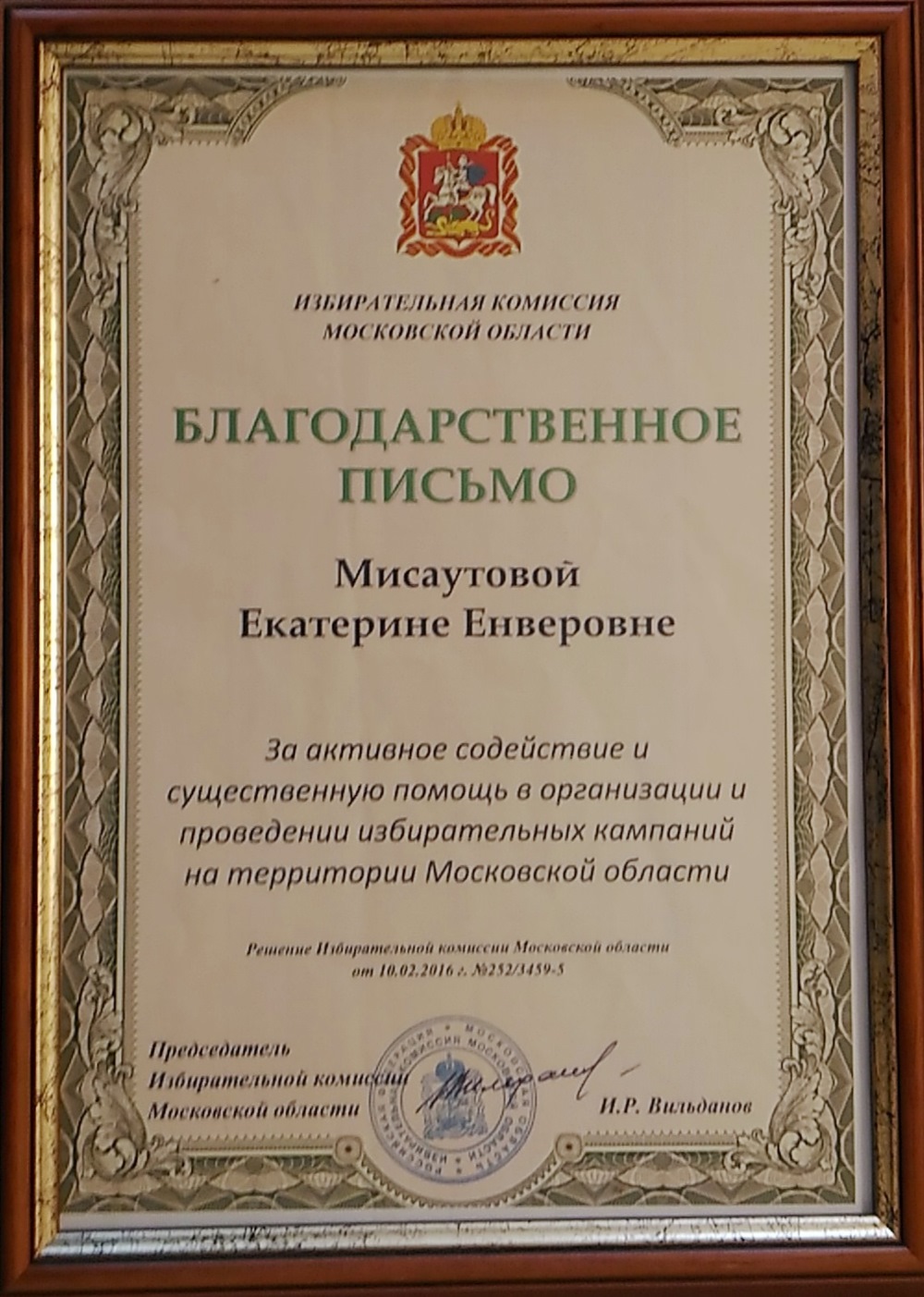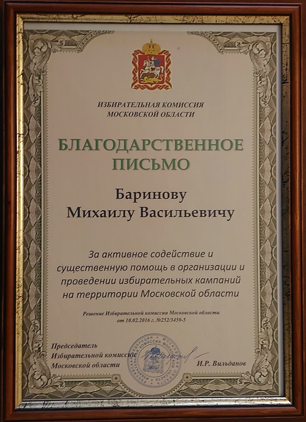 28 марта в администрации Лыткарина Глава города Евгений Серёгин провел торжественную церемонию награждения. За активное содействие и существенную помощь в организации и проведении избирательных кампаний на территории Московской области Благодарственным письмом Избирательной комиссии Московской области были награждены: Екатерина Мисаутова — инспектор ОДН отдела полиции по городскому округу Лыткарино и Михаил Баринов — участковый уполномоченный полиции отдела полиции по городскому округу Лыткарино.