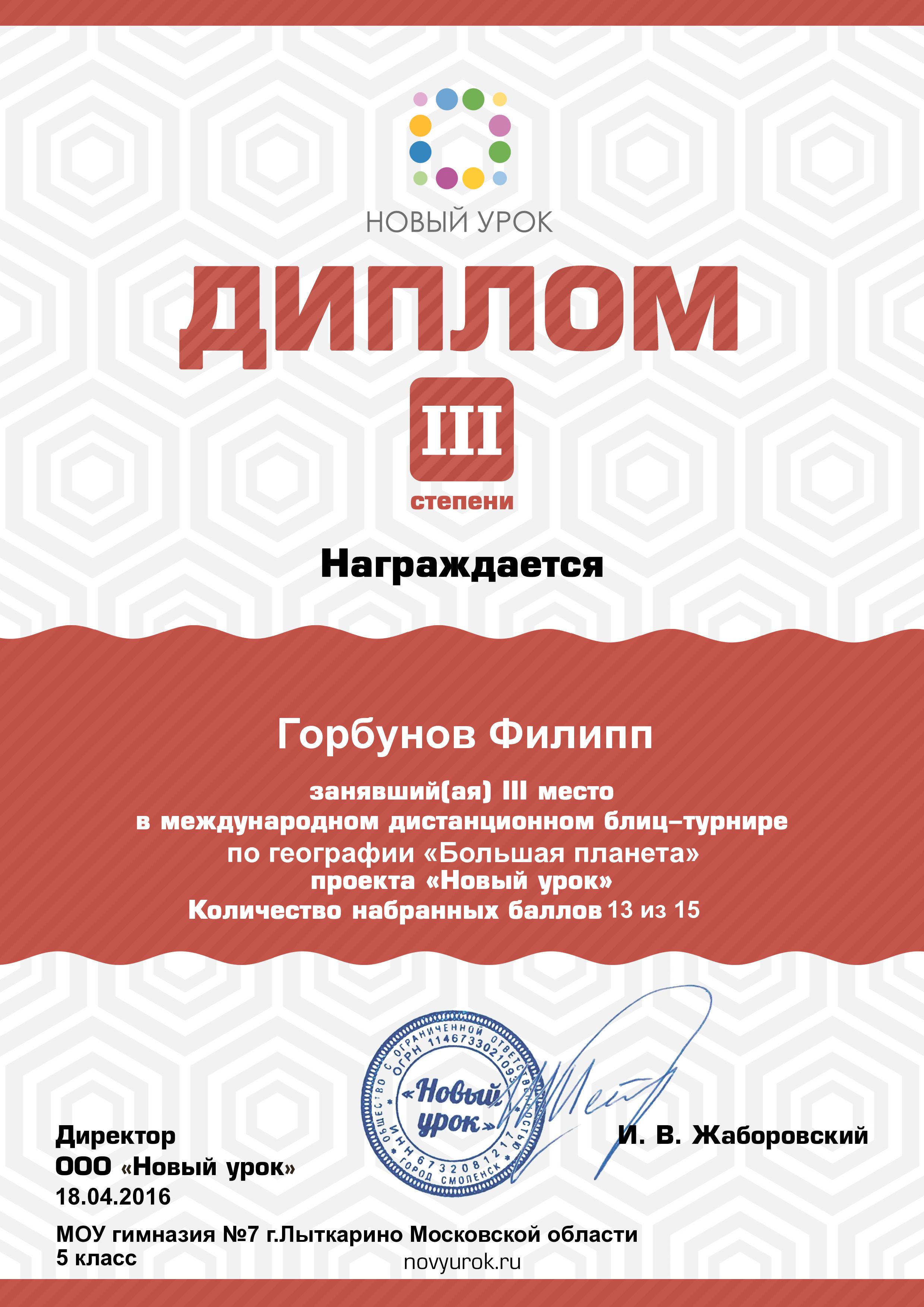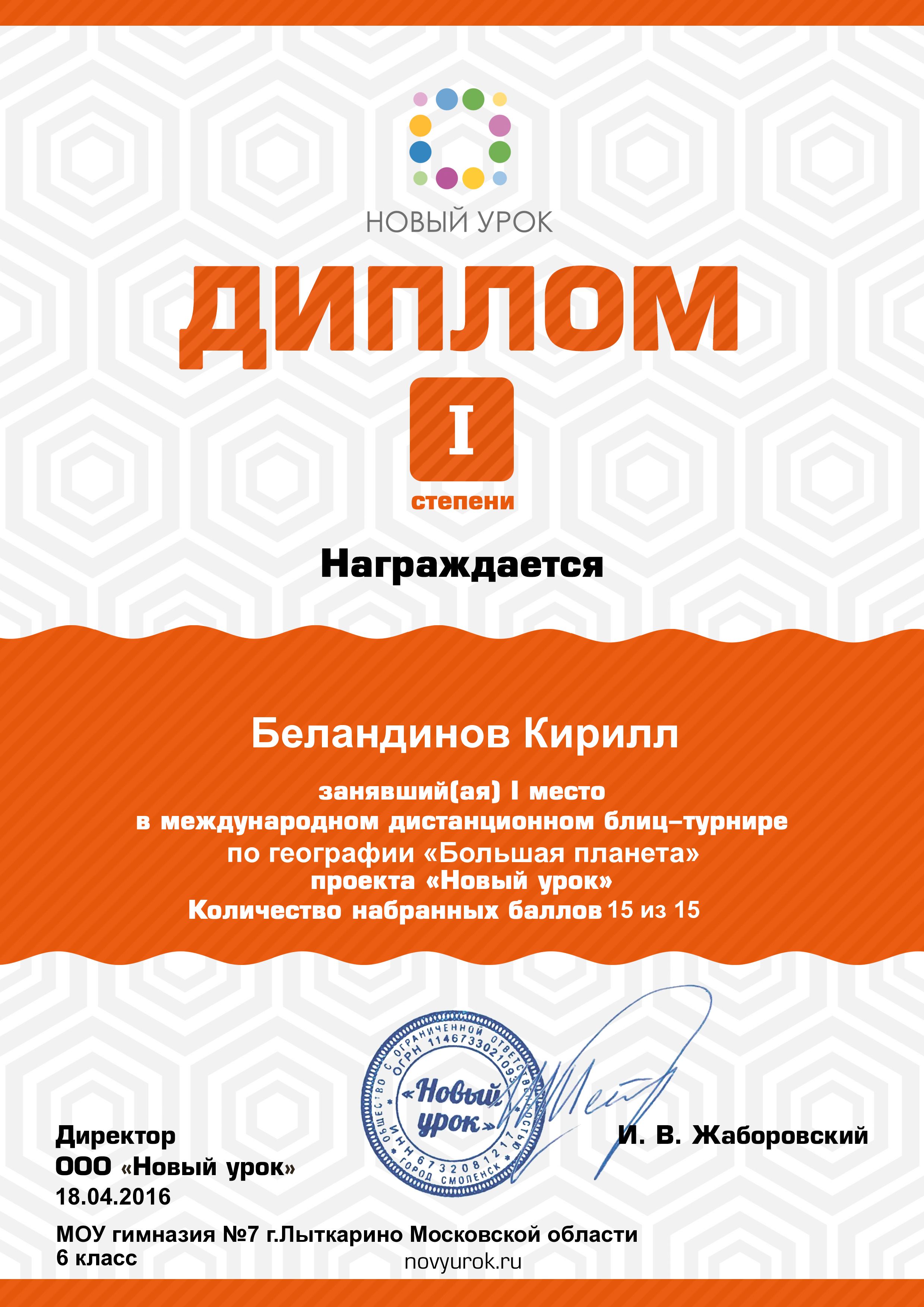 Поздравляем учащихся 5, 6 классов, принявших участие в международном дистанционном блиц-турнире по географии «Большая планета» проекта «Новый урок» под руководством учителя географии Юдановой Т.Б. Ребята достойно представили гимназию №7 г. Лыткарино, показав высокий уровень географических знаний. Ребята были награждены дипломами 1 и 3 степени. Учащиеся 5 класса: Егорова Алиса -диплом 1 степени, Горбунов Филипп- диплом 3 степени, Яковлева Екатерина- диплом 3 степени, Симакова Ангелина- диплом 3 степени, Щемерова Дарья- диплом 3 степени. Учащиеся 6 класса: Беландинов Кирилл — диплом 1 степени, Талаева Эвелина- диплом 3 степени, Байкова Анастасия- диплом 3 степени, Власова Анастасия- диплом 3 степени, Никулова Вероника- диплом 3 степени, Егорова Анастасия- диплом 3 степени. Юданова Татьяна Борисовна была отмечена свидетельством и благодарностью за подготовку учасников и победителей турнира.