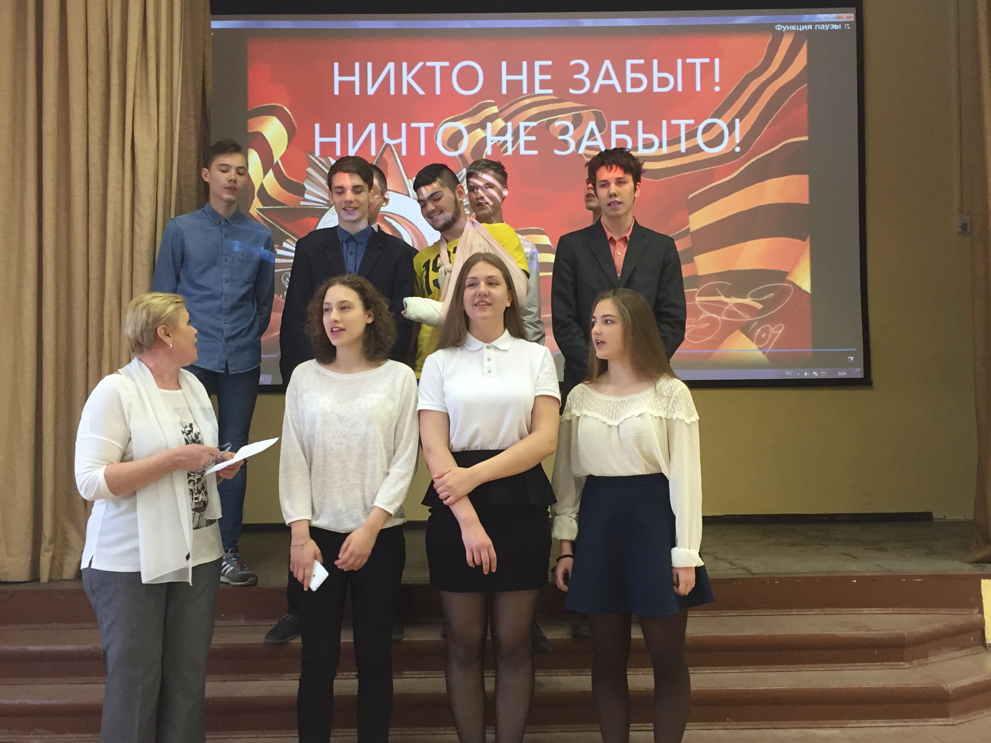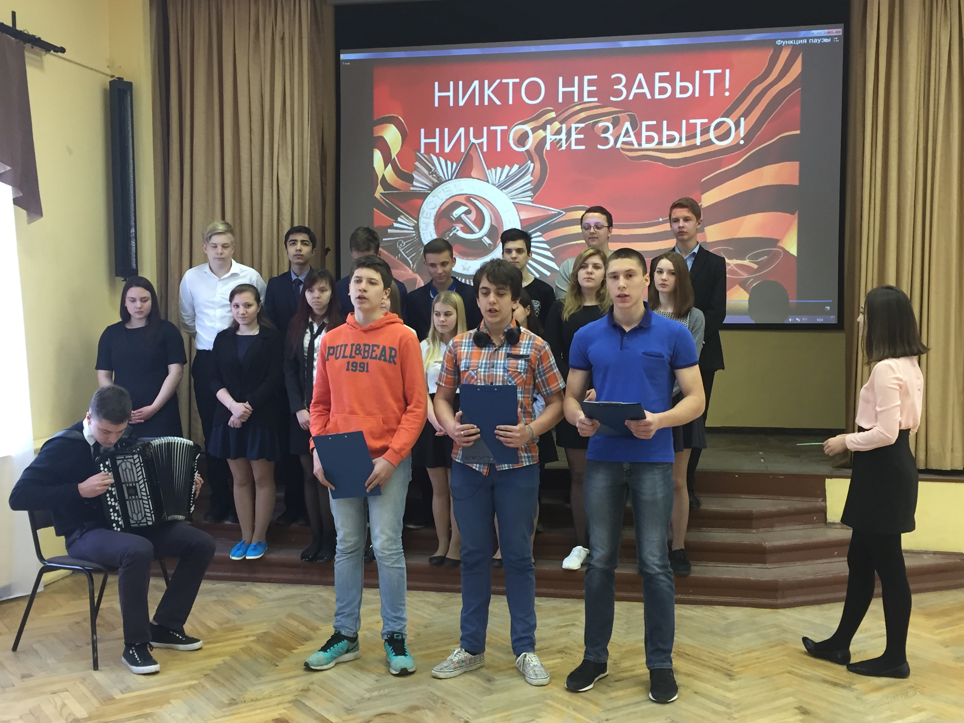 Традиционно накануне праздника Великой Победы в МОУ Гимназии № 1 прошел фестиваль военной песни. После небольшого кинолектория, посвященного предстоящему событию, каждый класс исполнил песню о Великой войне. «Марш защитников Москвы», «Катюша», «От героев былых времен», «На безымянной высоте», «Песенка фронтового шофера», «Три танкиста» – это неполный перечень прозвучавших песен. По наблюдениям учителей школы, интерес к военной песне у современных школьников не ослабевает. Песни о войне отличаются глубоким идейным смыслом и музыкальностью, пробуждают чувство огромной гордости за свое Отечество, воспитывают в подрастающем поколении патриотизм.
