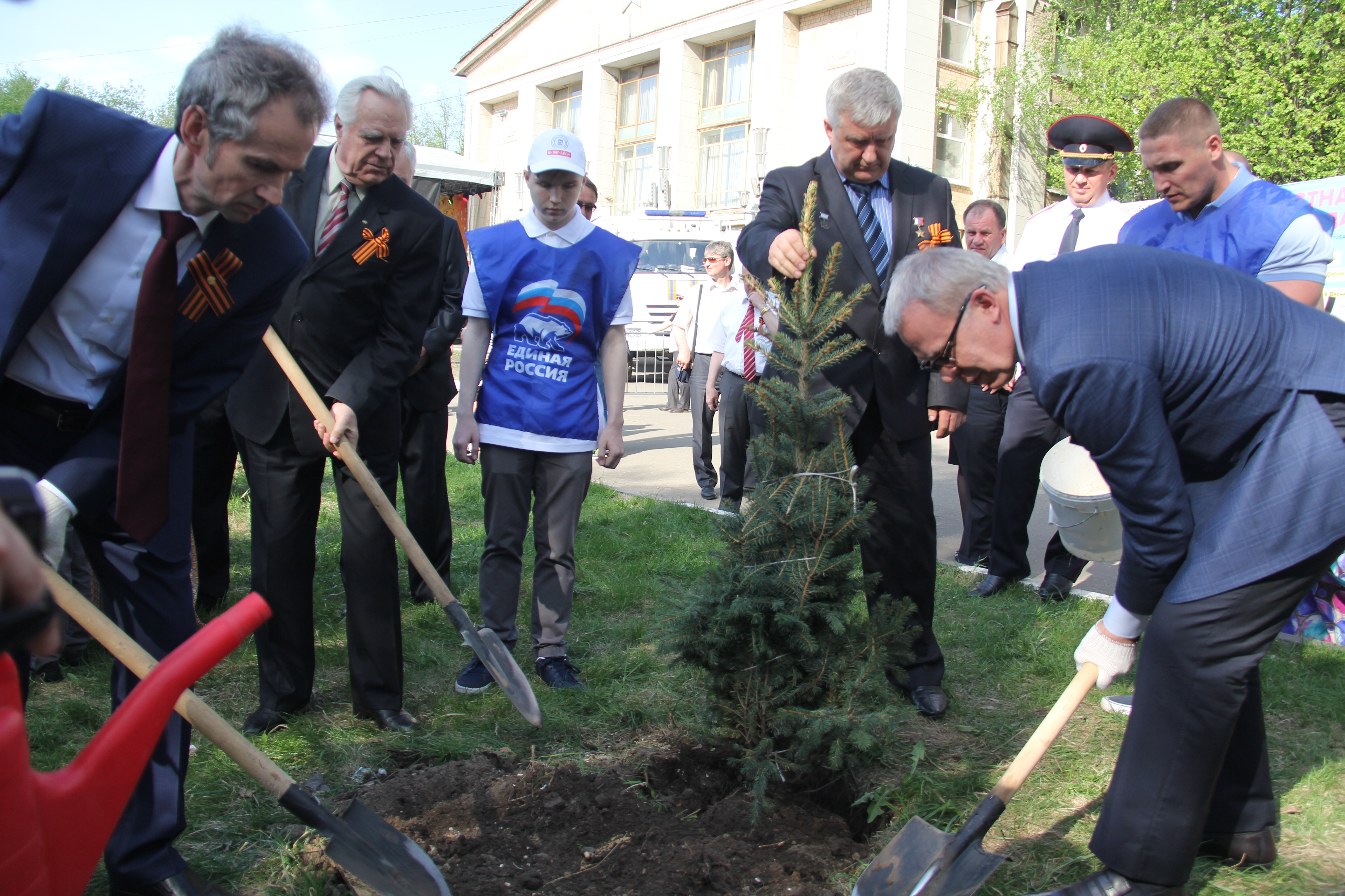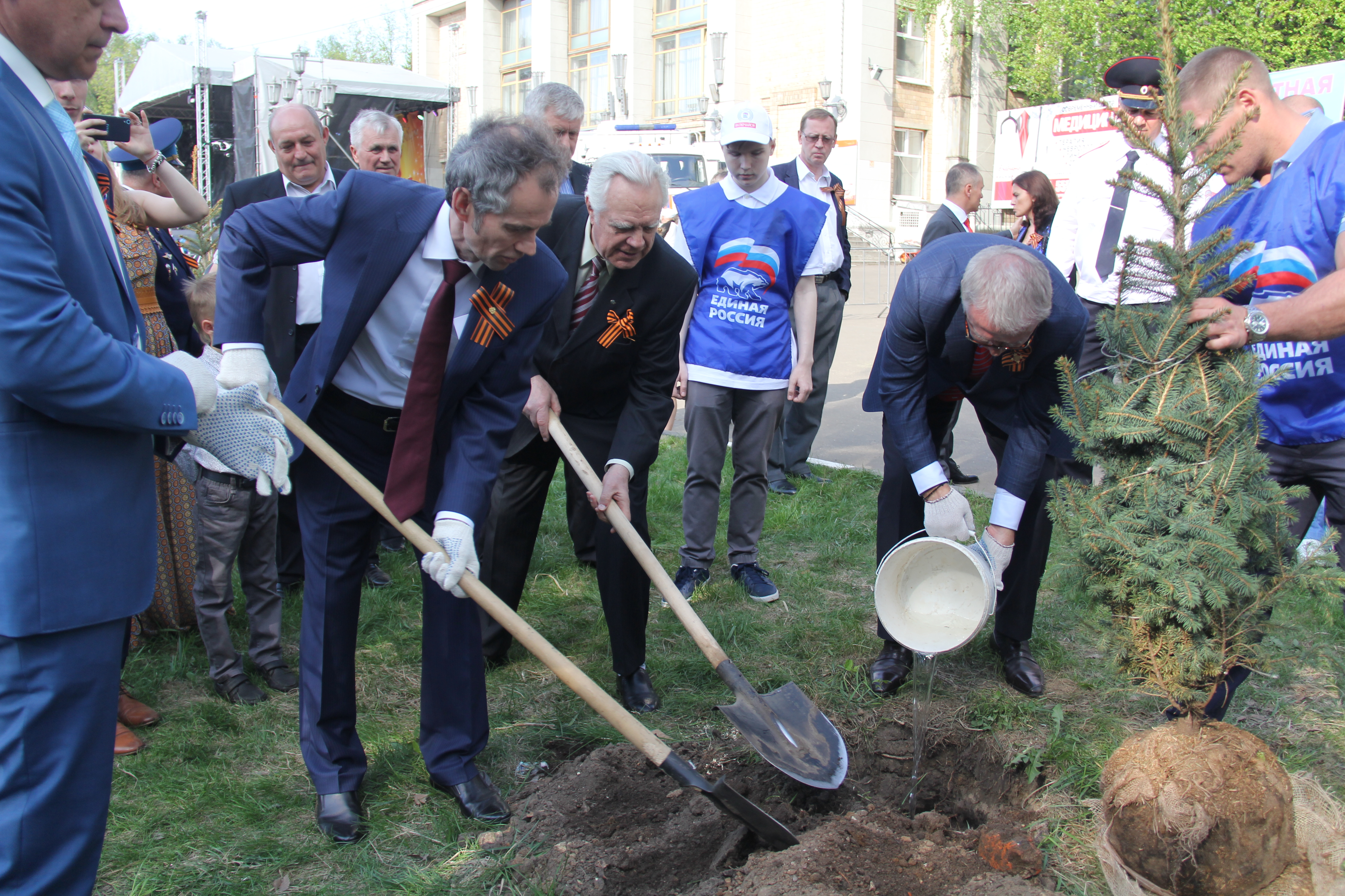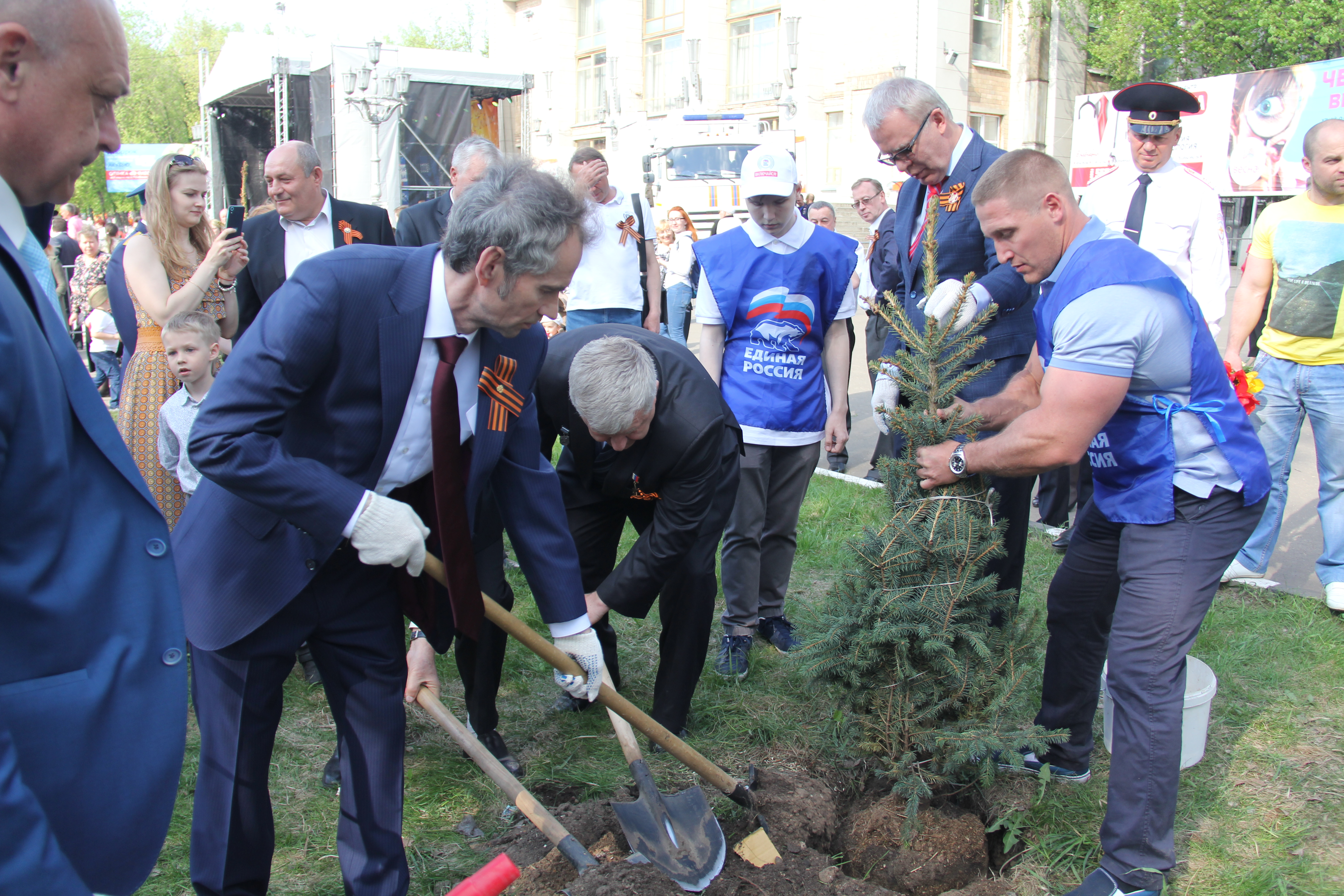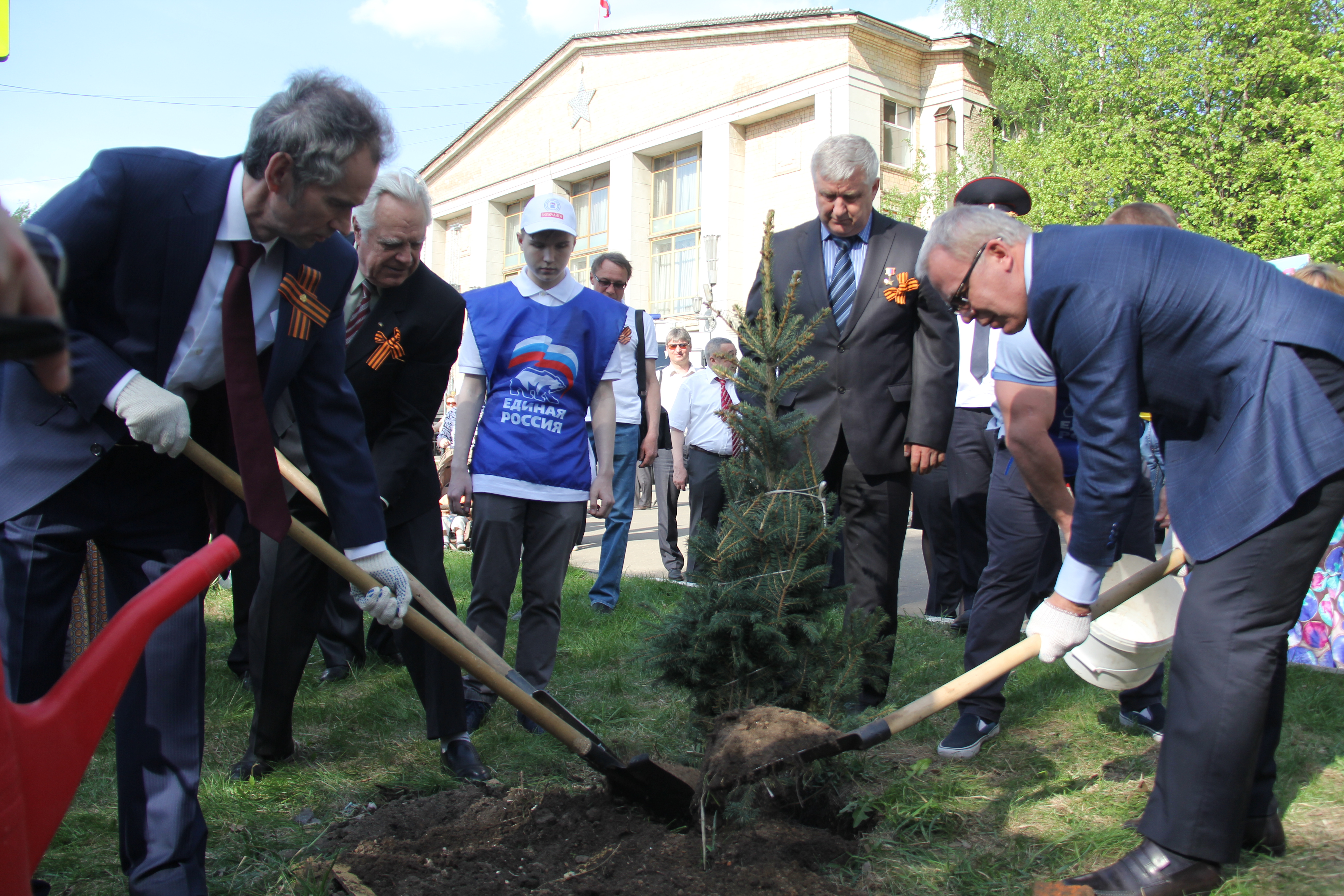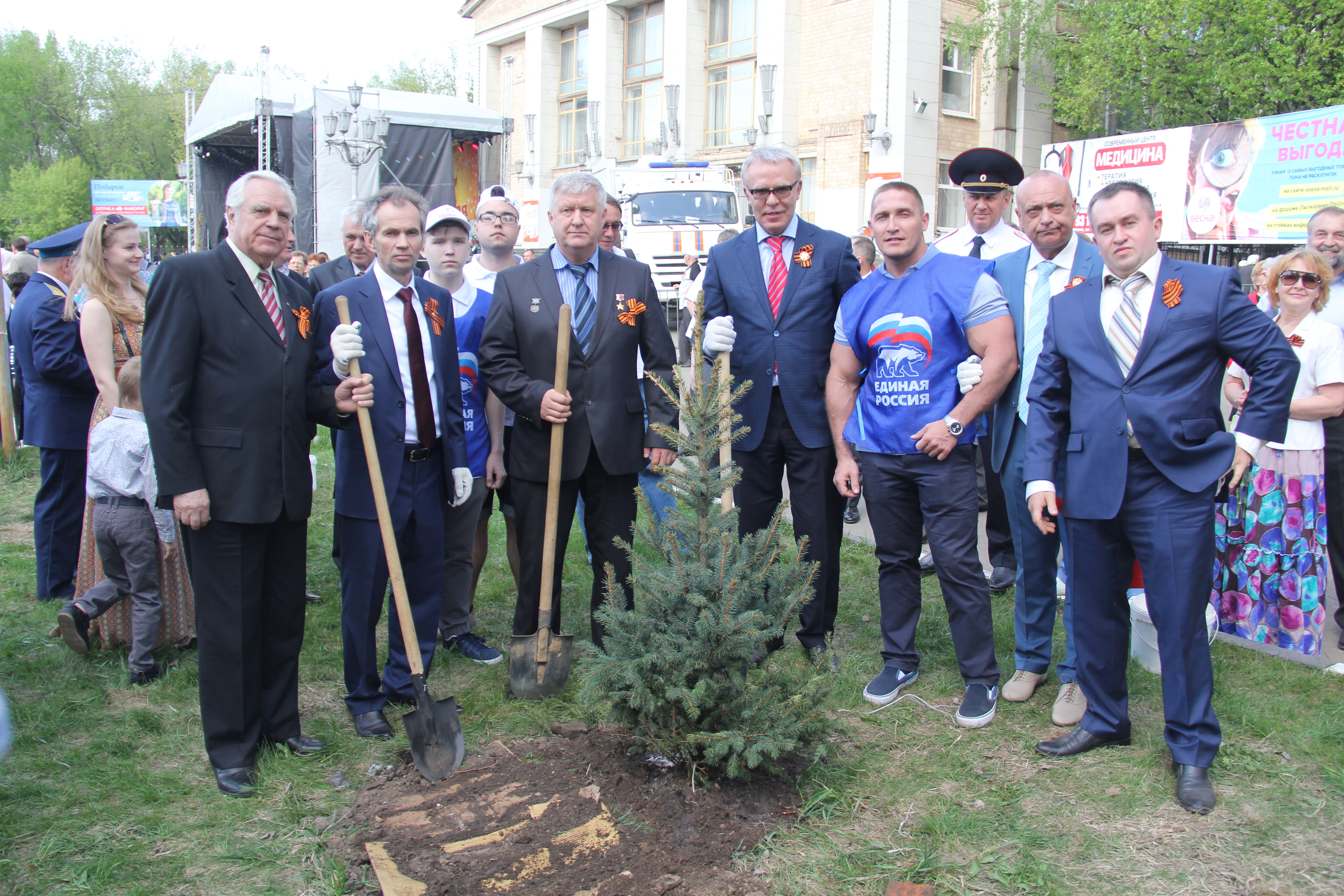 Глава города Лыткарино Евгений Серёгин и член Совета Федераций Вячеслав Фетисов дали старт областной акции «Лес Победы» в Лыткарине, посадив на центральной городской площади голубую ель.