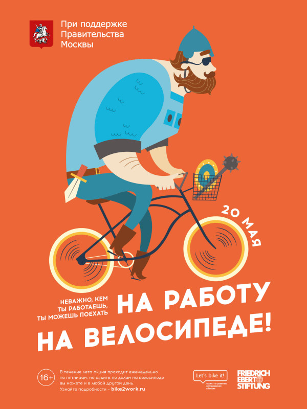 В пятницу, 20 мая в Москве и в других городах России пройдёт акция «На работу на велосипеде». Совершите поездку на велосипеде, примите участие в конкурсах, воспользуйтесь специальными предложениями от партнёров акции и обменяйте утренние пробки на удовольствие, знакомое каждому с детства. Основная цель акции «На работу на велосипеде» — показать, что, вопреки существующим стереотипам, велосипед может быть эффективной и разумной транспортной альтернативой в Москве и Подмосковье. Он также является хорошим способом поддержания физической формы, инструментом для улучшения экологии и транспортной ситуации в городе.