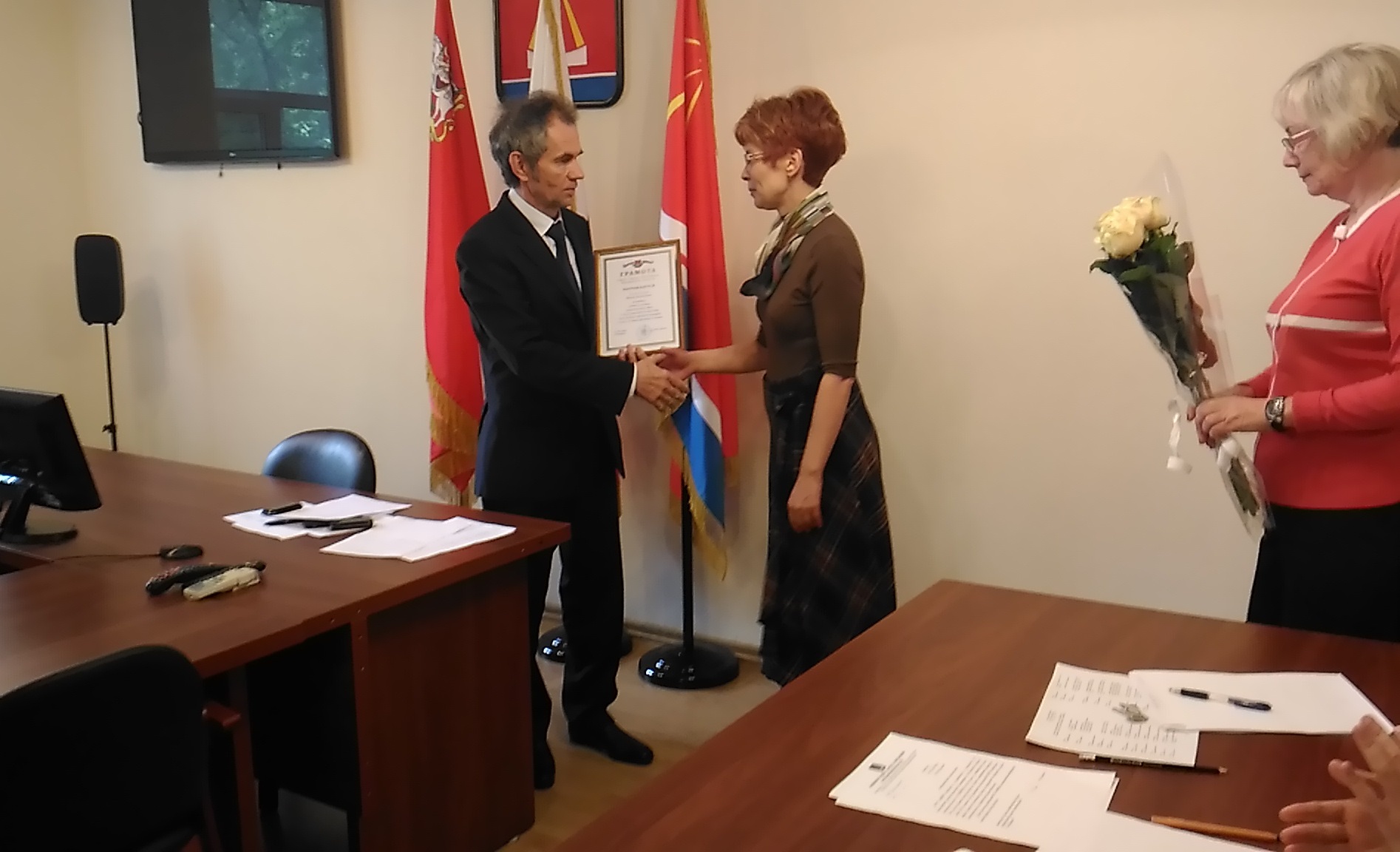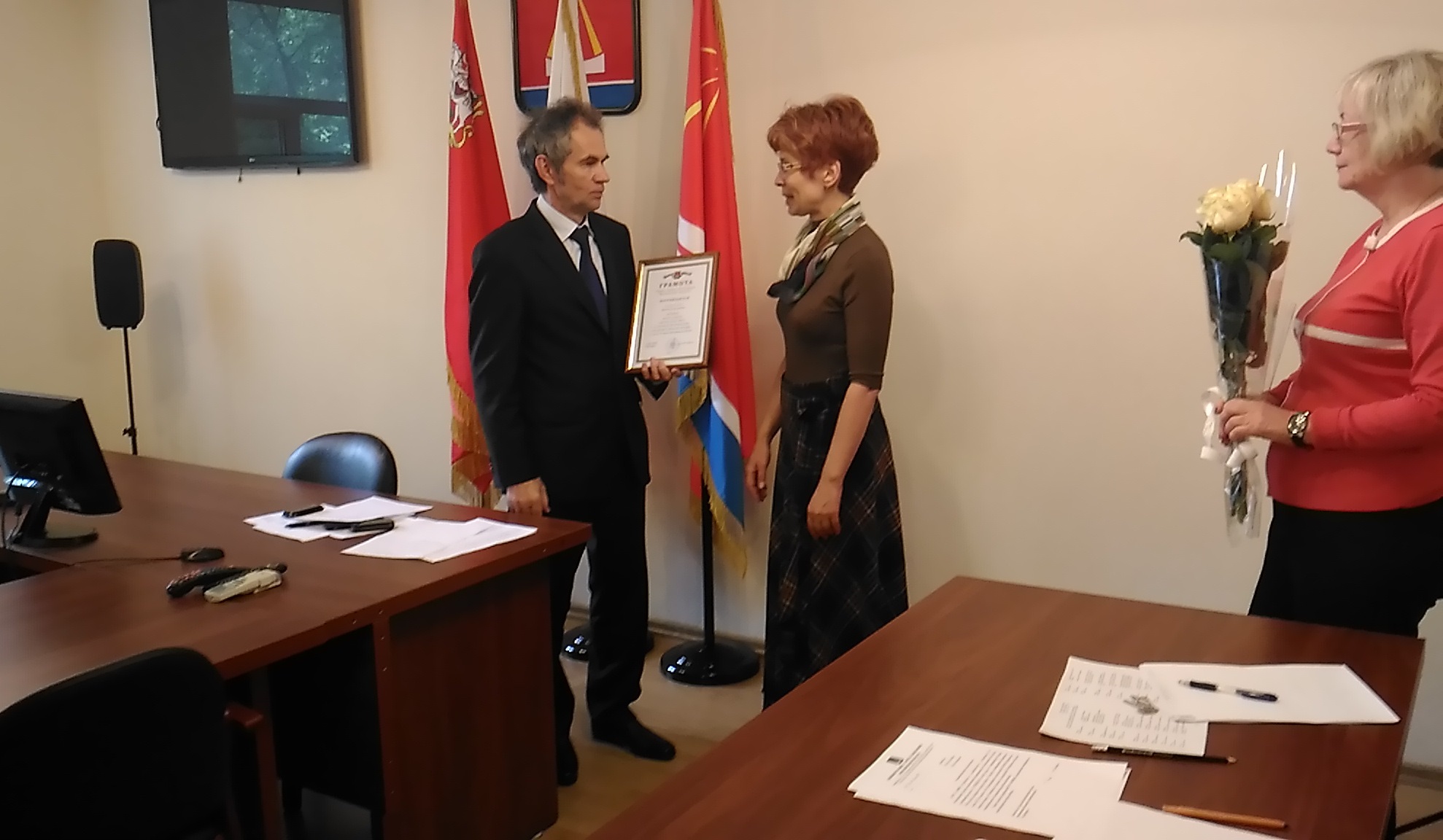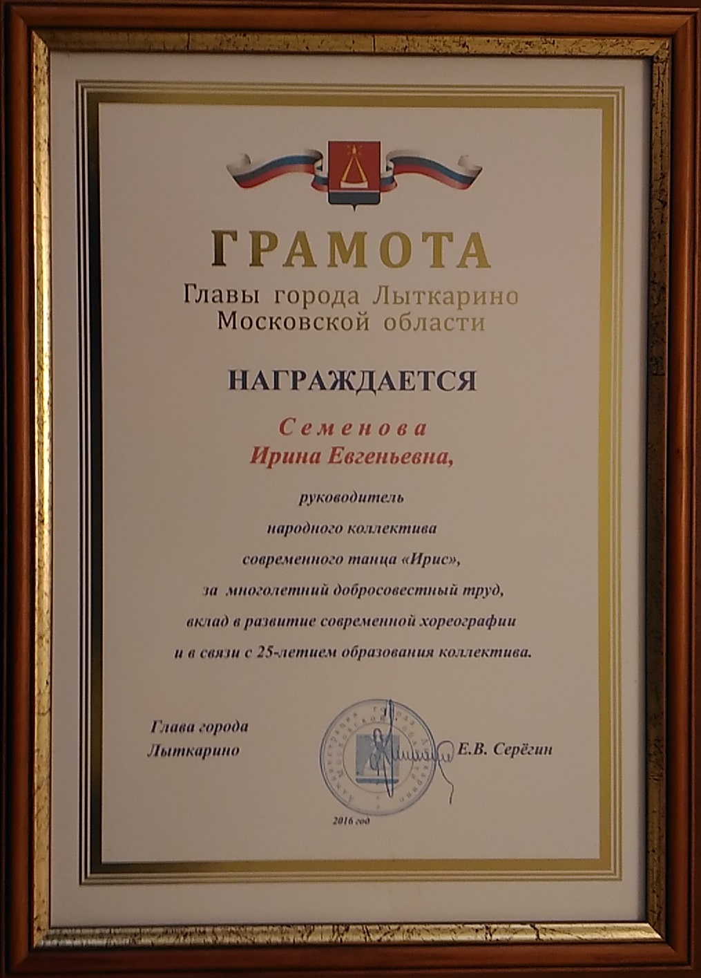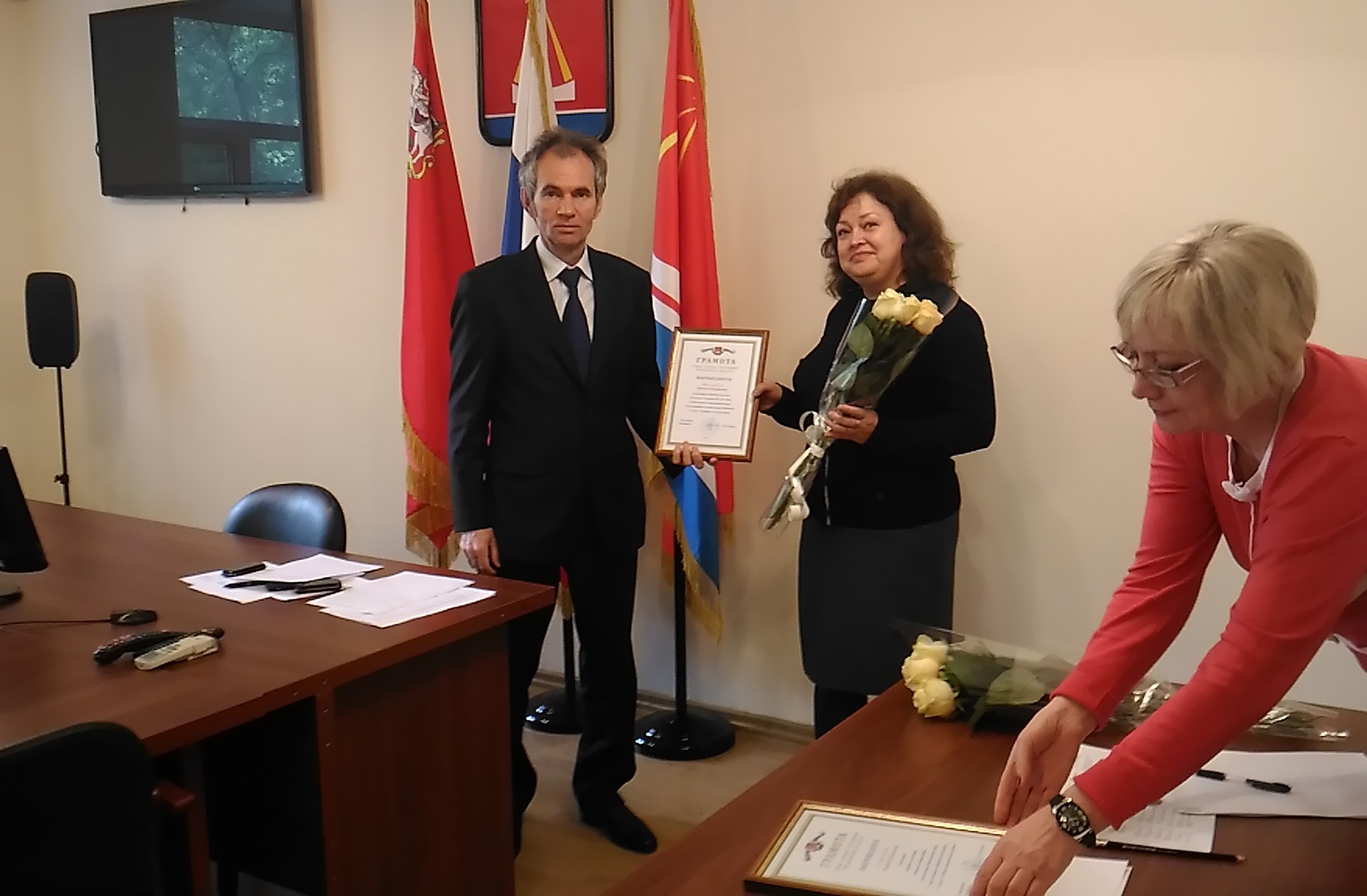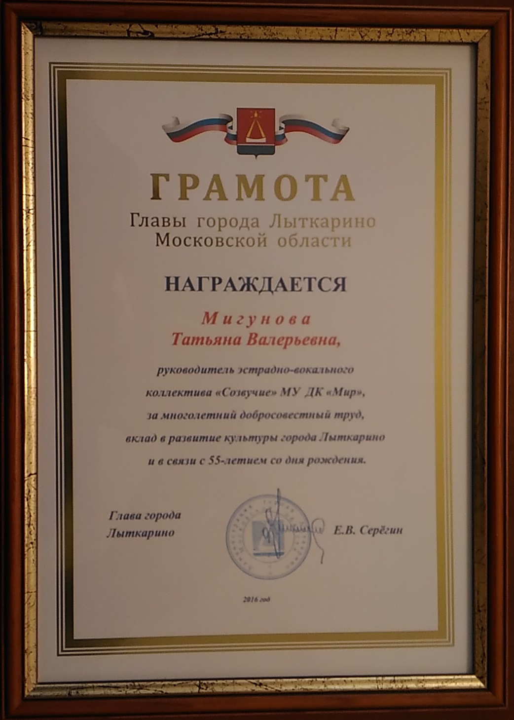 23 мая в администрации Лыткарина Глава города Евгений Серёгин провёл торжественную церемонию награждения. За многолетний и добросовестный труд были награждены: руководитель эстрадно-вокального коллектива «Созвучие» Татьяна Мигунова и руководитель народного коллектива современного танца «Ирис» Ирина Семёнова.