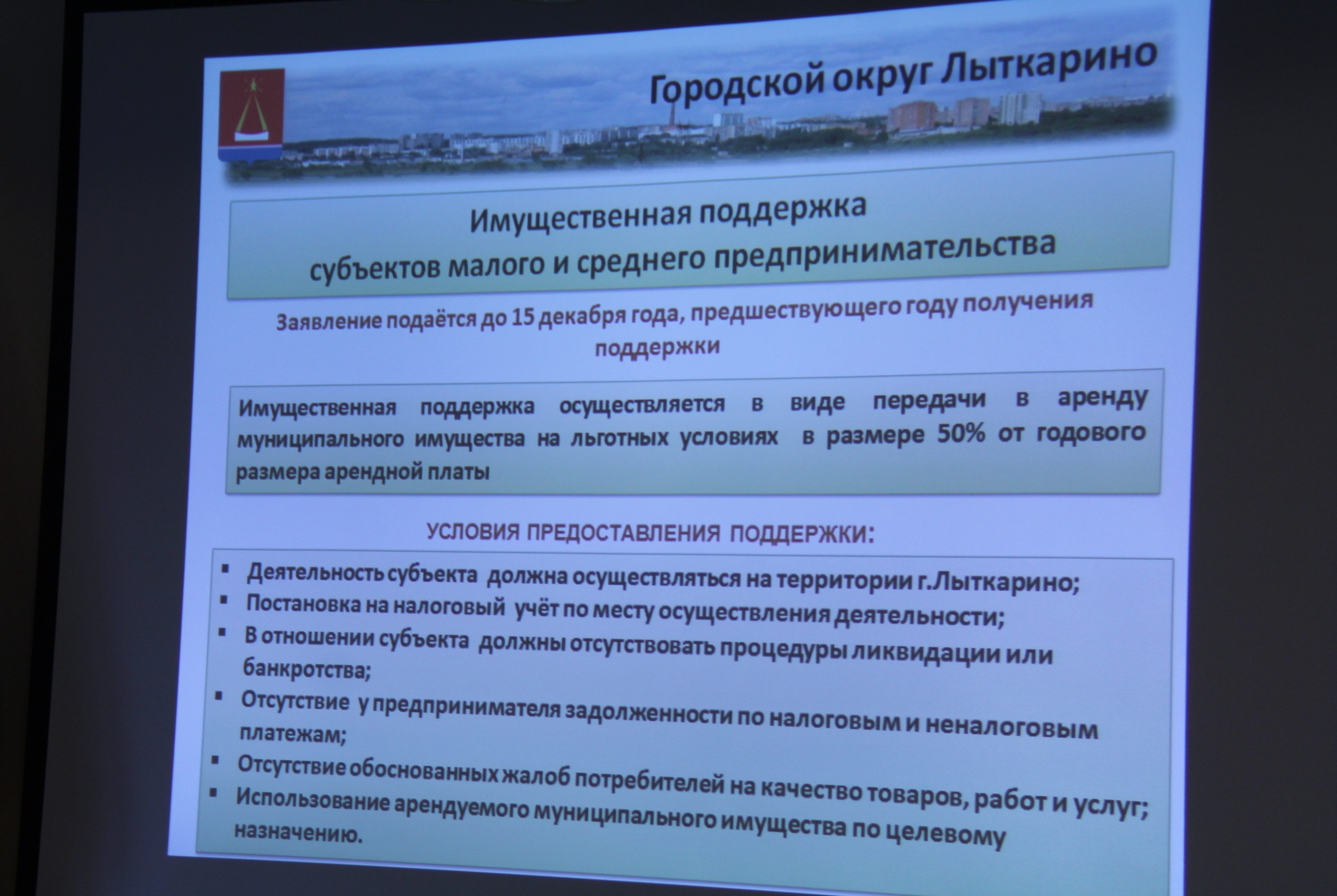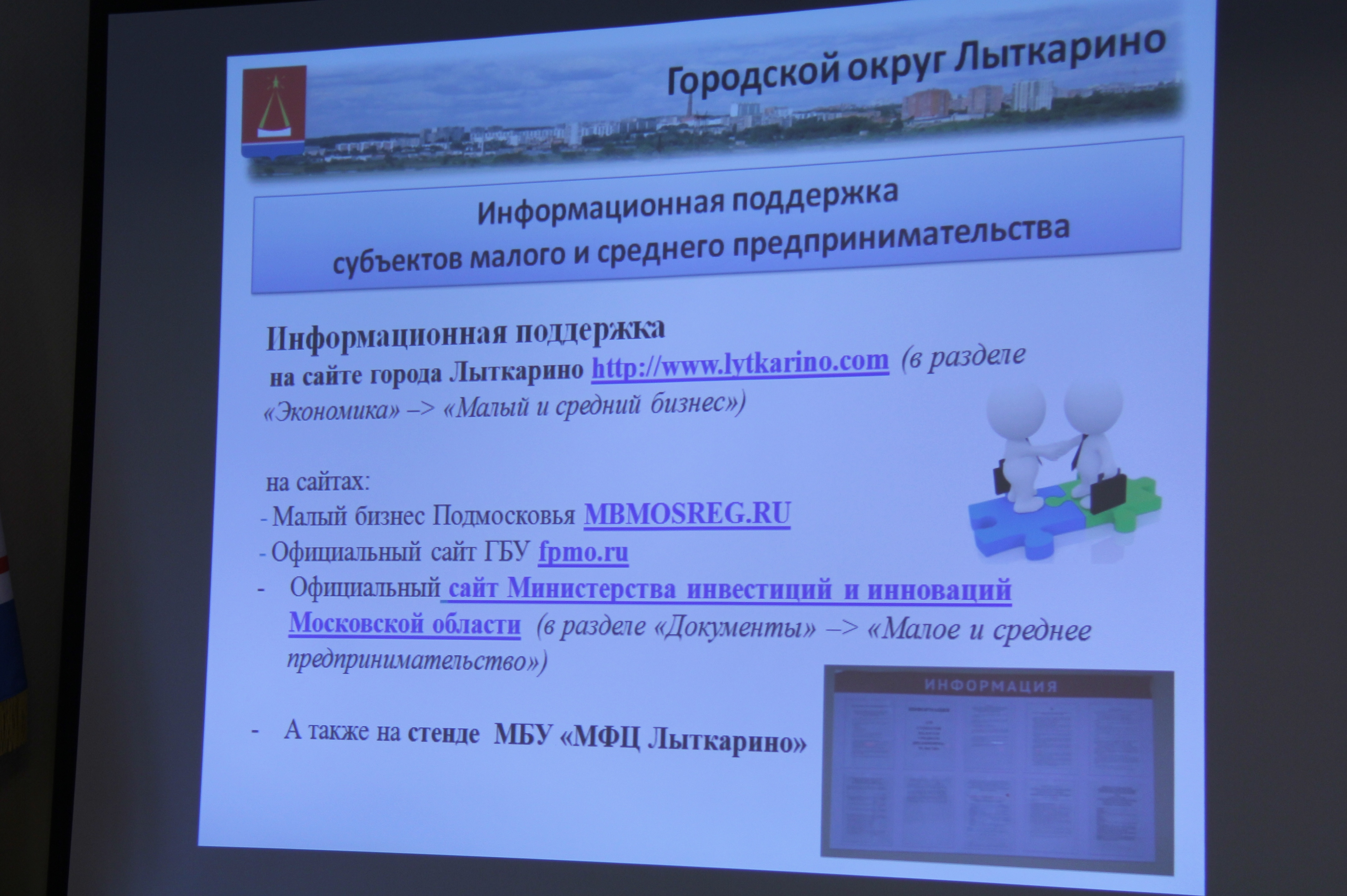 27 октября в администрации Лыткарина Глава города Евгений Серёгин провёл заседание Совета по развитию малого и среднего предпринимательства и инвестиционной деятельности в городе Лыткарино. В ходе заседания собравшимся была представлены презентация о мерах поддержки субъектов малого предпринимательства. Обсуждалась роль малого в экономике города. Далее встреча перешла в формат «вопрос-ответ», Глава города и предприниматели смогли обменяться идеями и мнениями.